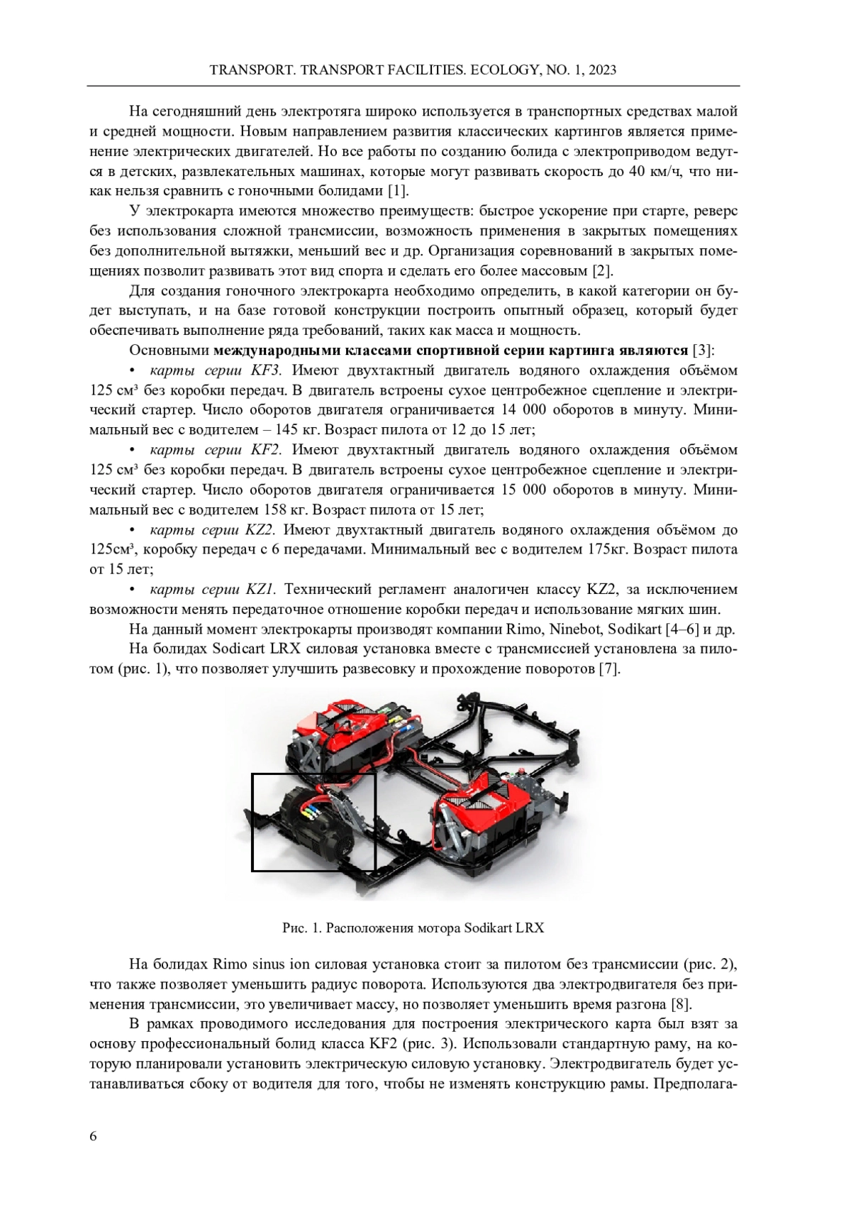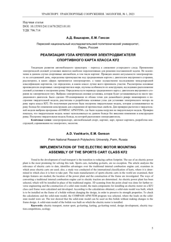 Тенденции развития автомобильного транспорта - переход к снижению углеродного следа. Применение электрической силовой установки является наиболее перспективным для решения поставленной задачи. Не исключение в данном случае спортивные автомобили, в том числе картинг. Проведен анализ актуальности электрокартинга на сегодняшний день, определены преимущества над традиционным картом с двигателем внутреннего сгорания, рассмотрено, в каких сферах применяется электрокартинг, а также осуществлено исследование международной классификации картингов, где определено, в каком классе лучше всего принимать участие. Рассмотрены основные производители спортивных электрокартингов в мире, изучены особенности их конструкции, исследовано расположение силовой установки и построение рамы. Определены пути перевода традиционного карта с двигателем внутреннего сгорания на электрическую тягу. Выбрана электрическая силовая установка, которая будет устанавливаться на место традиционного двигателя. Было сделано 3D-сканирование из облака точек для дальнейшего реверс инжиниринга и построение твердотельной модели, рассчитаны и разработаны основные узлы для установки электрического мотора на раму карта класса KF2. По полученным расчетам была построена твердотельная модель, которая устанавливается на раму болида без изменения конструкции для сохранения её прочностных свойств. Для проверки расчетов и твердотельной модели выбрана программа «КОМПАС APM FEM», где были заданы нагрузки на твердотельную модель. Проверка показала, что твердотельная модель может использоваться на данном болиде без внесения изменения в конструкцию рамы. Построена твердотельная модель болида, на которой расположен электродвигатель.