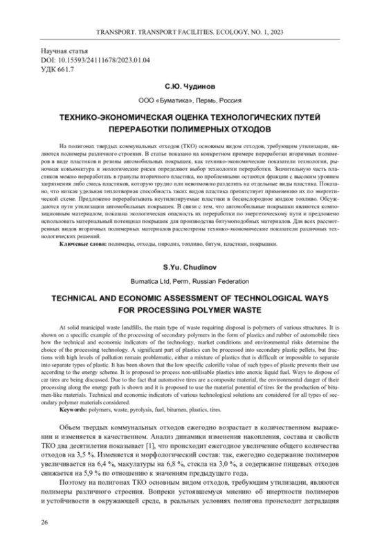 На полигонах твердых коммунальных отходов (ТКО) основным видом отходов, требующим утилизации, являются полимеры различного строения. В статье показано на конкретном примере переработки вторичных полимеров в виде пластиков и резины автомобильных покрышек, как технико-экономические показатели технологии, рыночная конъюнктура и экологические риски определяют выбор технологии переработки. Значительную часть пластиков можно переработать в гранулы вторичного пластика, но проблемными остаются фракции с высоким уровнем загрязнения либо смесь пластиков, которую трудно или невозможно разделить на отдельные виды пластика. Показано, что низкая удельная теплотворная способность таких видов пластика препятствует применению их по энергетической схеме. Предложено перерабатывать неутилизируемые пластики в бескислородное жидкое топливо. Обсуждаются пути утилизации автомобильных покрышек. В связи с тем, что автомобильные покрышки являются композиционным материалом, показана экологическая опасность их переработки по энергетическому пути и предложено использовать материальный потенциал покрышек для производства битумоподобных материалов. Для всех рассмотренных видов вторичных полимерных материалов рассмотрены технико-экономические показатели различных технологических решений.