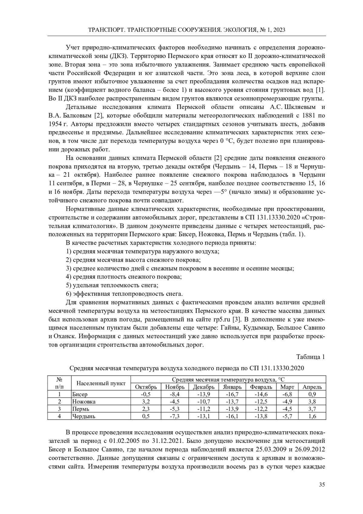 При решении задач распределения температуры в дорожной конструкции, в том числе при определении глубины промерзания, необходимо уделить особое внимание слою снежного покрова, расположенного на откосах и у основания насыпи автомобильной дороги. Дорожная конструкция промерзает неравномерно. Снег имеет малую теплопроводность, что способствует защите грунта от глубокого промерзания. В течение зимнего периода с проезжей части производят механизированную уборку снега, в то время как на откосах и у основания насыпи происходит накопление снежного массива на протяжении всего зимнего периода. Это создает сложную картину промерзания и существенно влияет на распределение изотермы 0 °C внутри дорожной конструкции. В связи с этим необходимо определить характеристики снежного покрова на территории Пермского края для получения более точной картины промерзания конструкции. Характеристики снежного покрова существенно зависят от внешних климатических факторов и условий местности. Произведен анализ климатических характеристик на восьми метеостанциях Пермского края. Выявлено различие между нормативными и фактическими значениями температуры наружного воздуха в период с октября по апрель. Определена средняя месячная высота снежного покрова, а также вероятность установления снежного покрова в осенние месяцы и вероятность сохранения снежного покрова в апреле. Проанализирован опыт исследования теплофизических характеристик снежного покрова российских и зарубежных ученых и выбраны необходимые значения плотности и теплопроводности снега. Рассчитана удельная теплоемкость снежного покрова толщиной до 30 см.