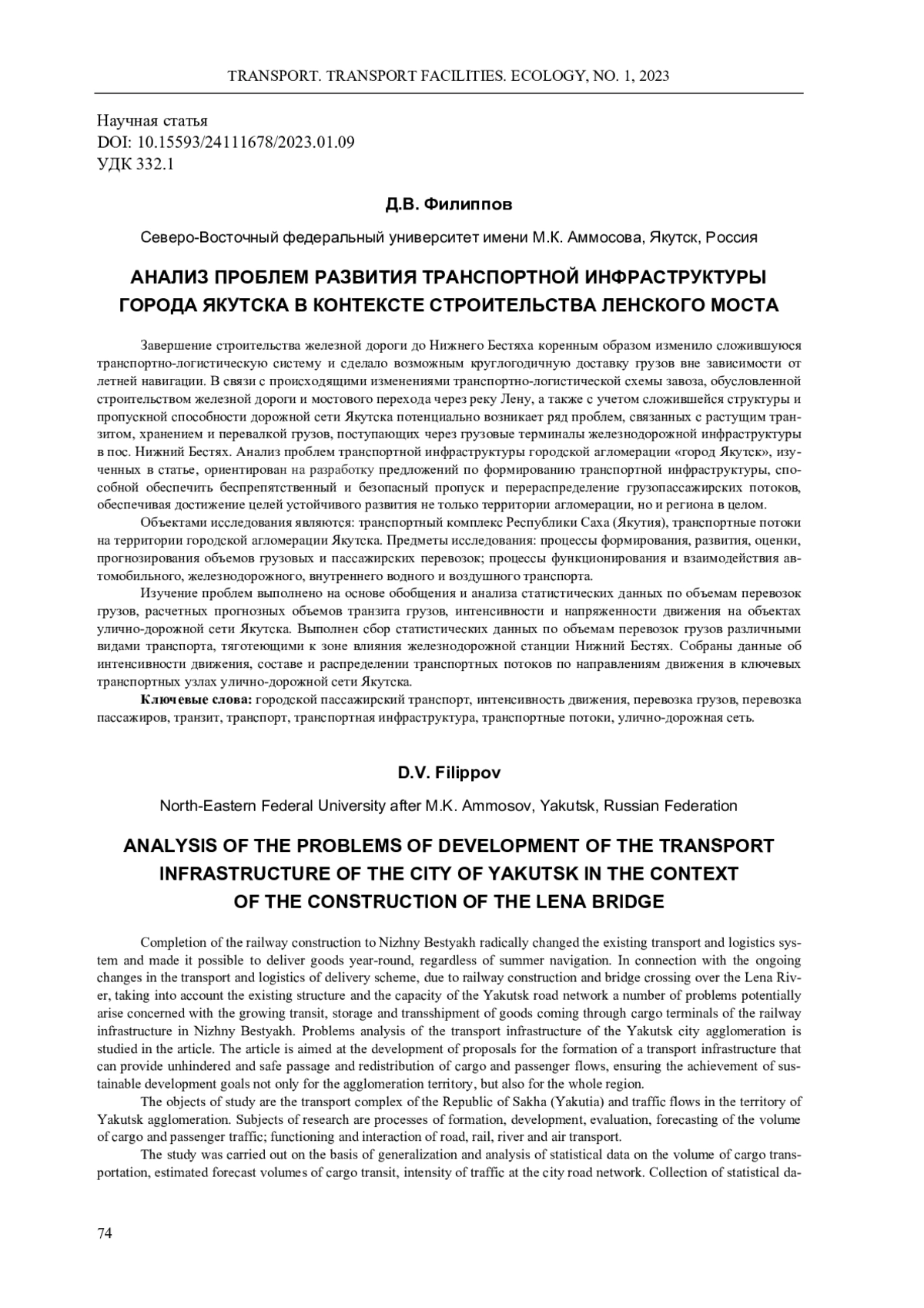 Завершение строительства железной дороги до Нижнего Бестяха коренным образом изменило сложившуюся транспортно-логистическую систему и сделало возможным круглогодичную доставку грузов вне зависимости от летней навигации. В связи с происходящими изменениями транспортно-логистической схемы завоза, обусловленной строительством железной дороги и мостового перехода через реку Лену, а также с учетом сложившейся структуры и пропускной способности дорожной сети Якутска потенциально возникает ряд проблем, связанных с растущим транзитом, хранением и перевалкой грузов, поступающих через грузовые терминалы железнодорожной инфраструктуры в пос. Нижний Бестях. Анализ проблем транспортной инфраструктуры городской агломерации «город Якутск», изученных в статье, ориентирован на разработку предложений по формированию транспортной инфраструктуры, способной обеспечить беспрепятственный и безопасный пропуск и перераспределение грузопассажирских потоков, обеспечивая достижение целей устойчивого развития не только территории агломерации, но и региона в целом. Объектами исследования являются: транспортный комплекс Республики Саха (Якутия), транспортные потоки на территории городской агломерации Якутска. Предметы исследования: процессы формирования, развития, оценки, прогнозирования объемов грузовых и пассажирских перевозок; процессы функционирования и взаимодействия автомобильного, железнодорожного, внутреннего водного и воздушного транспорта. Изучение проблем выполнено на основе обобщения и анализа статистических данных по объемам перевозок грузов, расчетных прогнозных объемов транзита грузов, интенсивности и напряженности движения на объектах улично-дорожной сети Якутска. Выполнен сбор статистических данных по объемам перевозок грузов различными видами транспорта, тяготеющими к зоне влияния железнодорожной станции Нижний Бестях. Собраны данные об интенсивности движения, составе и распределении транспортных потоков по направлениям движения в ключевых транспортных узлах улично-дорожной сети Якутска.