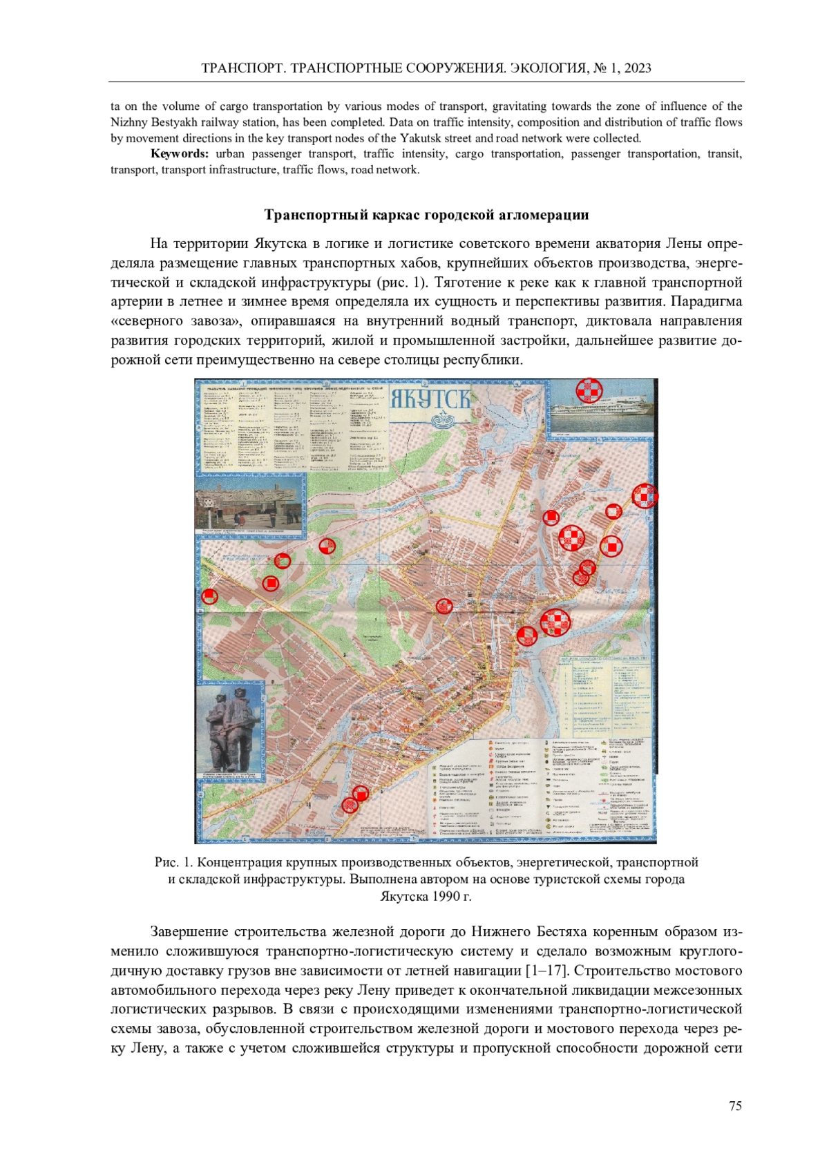На территории Якутска в логике и логистике советского времени акватория Лены определяла размещение главных транспортных хабов, крупнейших объектов производства, энергетической и складской инфраструктуры (рис. 1). Тяготение к реке как к главной транспортной артерии в летнее и зимнее время определяла их сущность и перспективы развития. Парадигма «северного завоза», опиравшаяся на внутренний водный транспорт, диктовала направления развития городских территорий, жилой и промышленной застройки, дальнейшее развитие дорожной сети преимущественно на севере столицы республики. Рис. 1. Концентрация крупных производственных объектов, энергетической, транспортной и складской инфраструктуры. Выполнена автором на основе туристской схемы города Якутска 1990 г. Завершение строительства железной дороги до Нижнего Бестяха коренным образом изменило сложившуюся транспортно-логистическую систему и сделало возможным круглогодичную доставку грузов вне зависимости от летней навигации [1–17]. Строительство мостового автомобильного перехода через реку Лену приведет к окончательной ликвидации межсезонных логистических разрывов. В связи с происходящими изменениями транспортно-логистической схемы завоза, обусловленной строительством железной дороги и мостового перехода через реку Лену, а также с учетом сложившейся структуры и пропускной способности дорожной сети