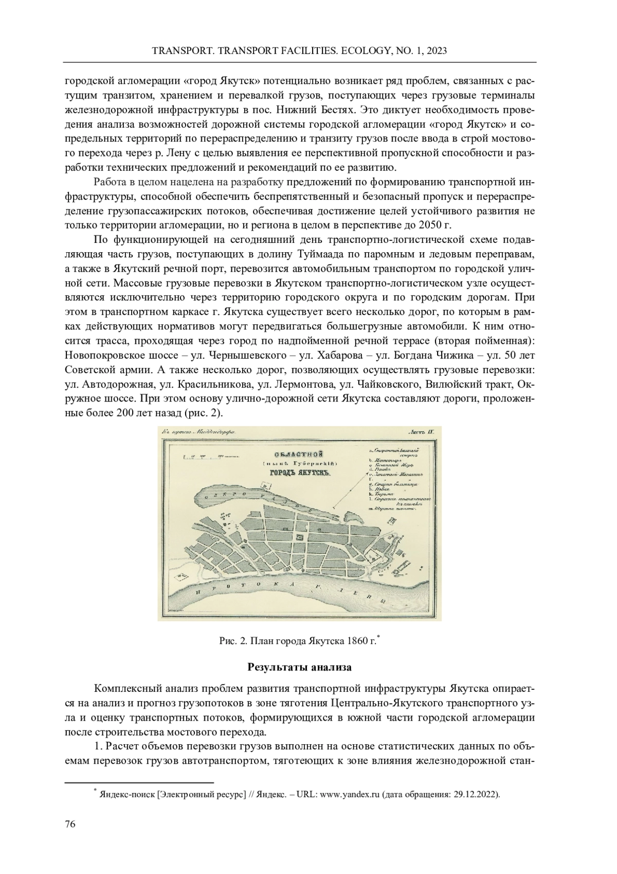 На основе анализа топографических планов г. Якутска и современных исследований изучены особенности эволюции городской дорожной сети и определены перспективы развития её транзитного потенциала. Выявлены два этапа развития улично-дорожной сети. На первом этапе сеть формировалась по логистическим принципам организации дорожного движения и грузопассажирских перевозок, осуществляемых гужевым транспортом. Переход ко второму этапу фиксируется по резкому увеличению городской территории и росту количества единиц автомобильного транспорта. Каркас дорожной инфраструктуры г. Якутска на втором этапе составляют дороги, основанные в начале XIX в. Автомобильный транспорт вытеснил из городского пространства гужевой транспорт. Одновременно в инфраструктуре и самой дорожной сети произошел ряд принципиальных изменений, проявившихся в необходимости разделения пешеходных и автомобильных потоков, введения обязательной регулировки транспортных и пешеходных потоков; организации движения общественного транспорта, включая строительство остановок; создании дневных, ночных и зимних стоянок и гаражей для личного и общественного транспорта; формирования площадей и станций технического обслуживания автомобильного транспорта; строительства заправочных станций. Все изменения оказали крайне негативное влияние на возможности городской дорожной сети, касающиеся её пропускной способности, интенсивности движения и транзитного потенциала. Нормативные требования по организации дорожного движения автомобильного транспорта привели к уменьшению ширины проезжей части городских улиц в два раза, а регулирование движения на перекрестках уменьшило пропускную способность улиц также в два раза. Особую проблему для развития улично-дорожной сети представляют системы городского тепло-, водо- и газоснабжения, в первую очередь, магистральные и межквартальные трубопроводы, расположенные на поверхности. Установлено, что дорожная инфраструктура города по своей пропускной способности исчерпала свои возможности и не сможет обеспечить транзит грузов после строительства мостового перехода через р. Лену.