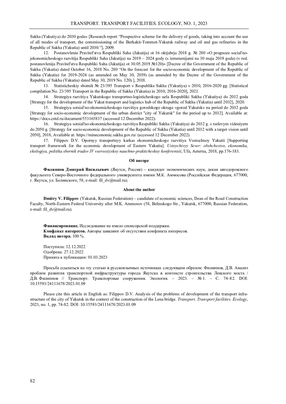 5. 	Filippov D.V. Approaches and features of economic efficiency assessment of the infrastructure transport projects // SHS Web of Conferences, 2021. - Vol. 112. - P. 00003.