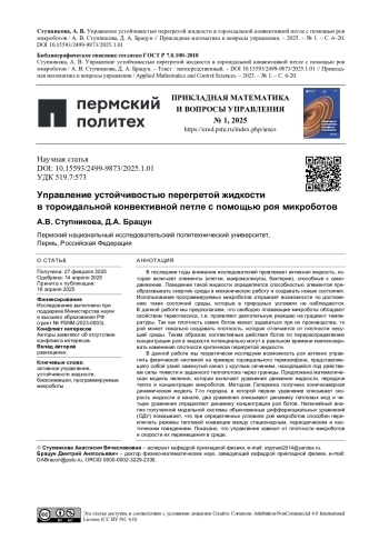 В последние годы внимание исследователей привлекает активная жидкость, которая включает элементы (клетки, макромолекулы, бактерии), способные к самодвижению. Поведение такой жидкости определяется способностью элементов преобразовывать энергию среды в механическую работу и создавать новые состояния. Использование программируемых микроботов открывает возможности по достижению таких состояний среды, которые в природных условиях не наблюдаются. В данной работе мы предполагаем, что свободно плавающие микроботы обладают свойством термотаксиса, т. е. проявляют двигательную реакцию на градиент температуры. Так как плотность самих ботов может задаваться при их производстве, то рой может локально создавать плотность, которая отличается от плотности несущей среды. Таким образом, коллективные действия ботов по перераспределению концентрации роя в жидкости потенциально могут в реальном времени компенсировать изменения плотности критически перегретой жидкости. В данной работе мы теоретически исследуем возможность роя активно управлять физической системой на примере тороидального термосифона, представляющего собой узкий замкнутый канал с круглым сечением, находящийся под действием силы тяжести и заданного теплопотока через границы. Предложена математическая модель явления, которая включает уравнения движения жидкости, передачи тепла и концентрации микроботов. Методом Галеркина получена конечномерная динамическая модель 7-го порядка, в которой первое уравнение описывает скорость жидкости в канале, два уравнения описывают динамику тепловых мод и четыре уравнения определяют динамику концентрации роя ботов. Нелинейный анализ полученной модельной системы обыкновенных дифференциальных уравнений (ОДУ) показывает, что при определенных условиях рой микроботов способен переключать режимы тепловой конвекции между стационарным, периодическим и хаотическим поведением. Показано, что управление зависит от плотности микроботов и скорости их перемещения в среде.