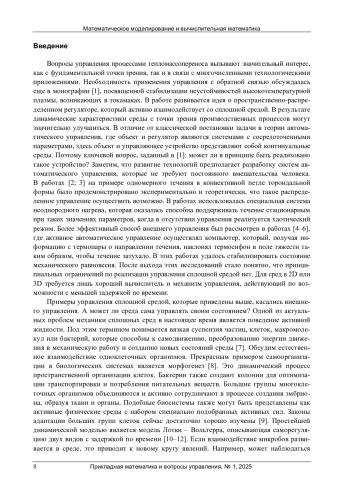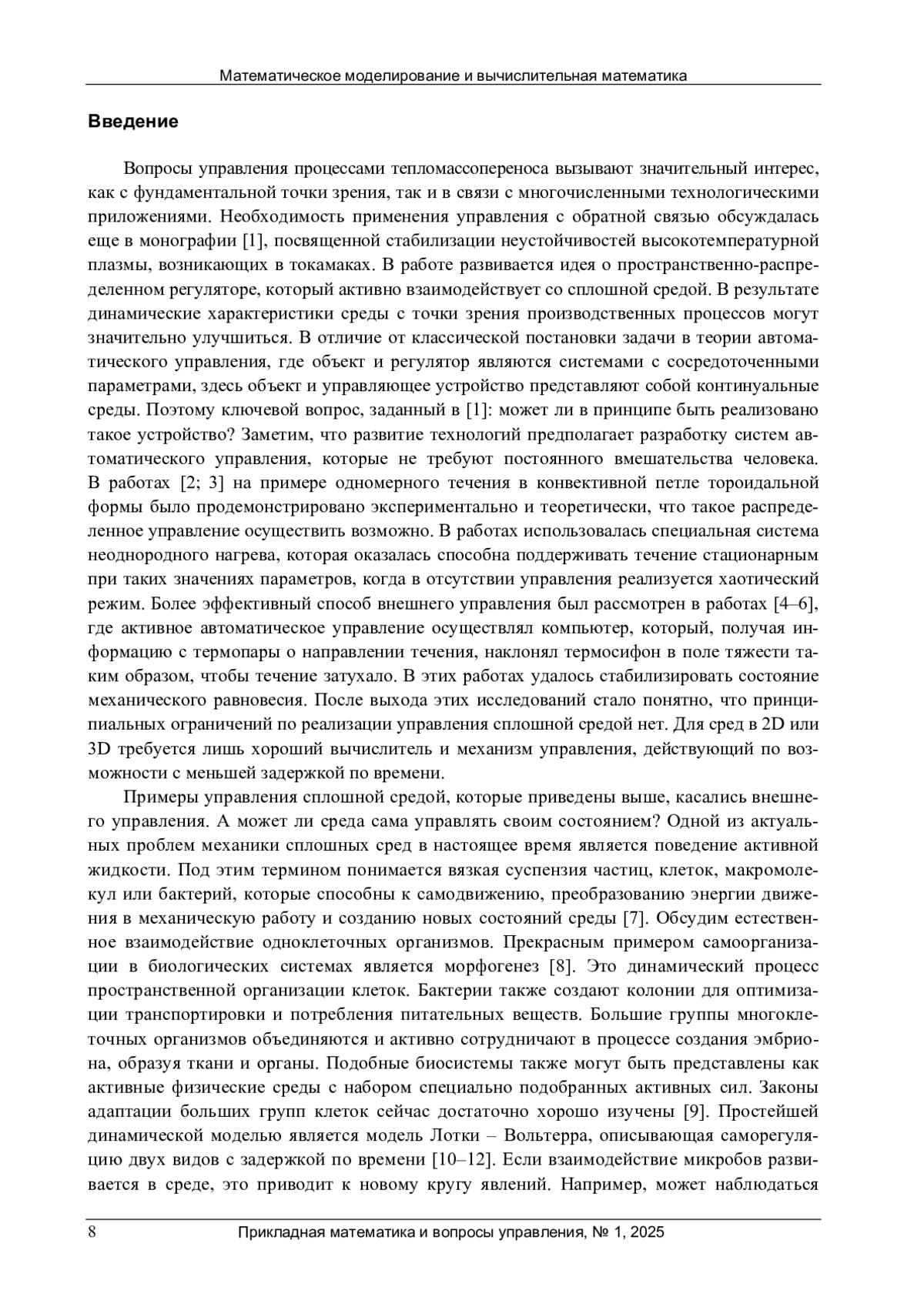 Вопросы управления процессами тепломассопереноса вызывают значительный интерес, как с фундаментальной точки зрения, так и в связи с многочисленными технологическими приложениями. Необходимость применения управления с обратной связью обсуждалась еще в монографии [1], посвященной стабилизации неустойчивостей высокотемпературной плазмы, возникающих в токамаках. В работе развивается идея о пространственно-распределенном регуляторе, который активно взаимодействует со сплошной средой. В результате динамические характеристики среды с точки зрения производственных процессов могут значительно улучшиться. В отличие от классической постановки задачи в теории автоматического управления, где объект и регулятор являются системами с сосредоточенными параметрами, здесь объект и управляющее устройство представляют собой континуальные среды. Поэтому ключевой вопрос, заданный в [1]: может ли в принципе быть реализовано такое устройство?