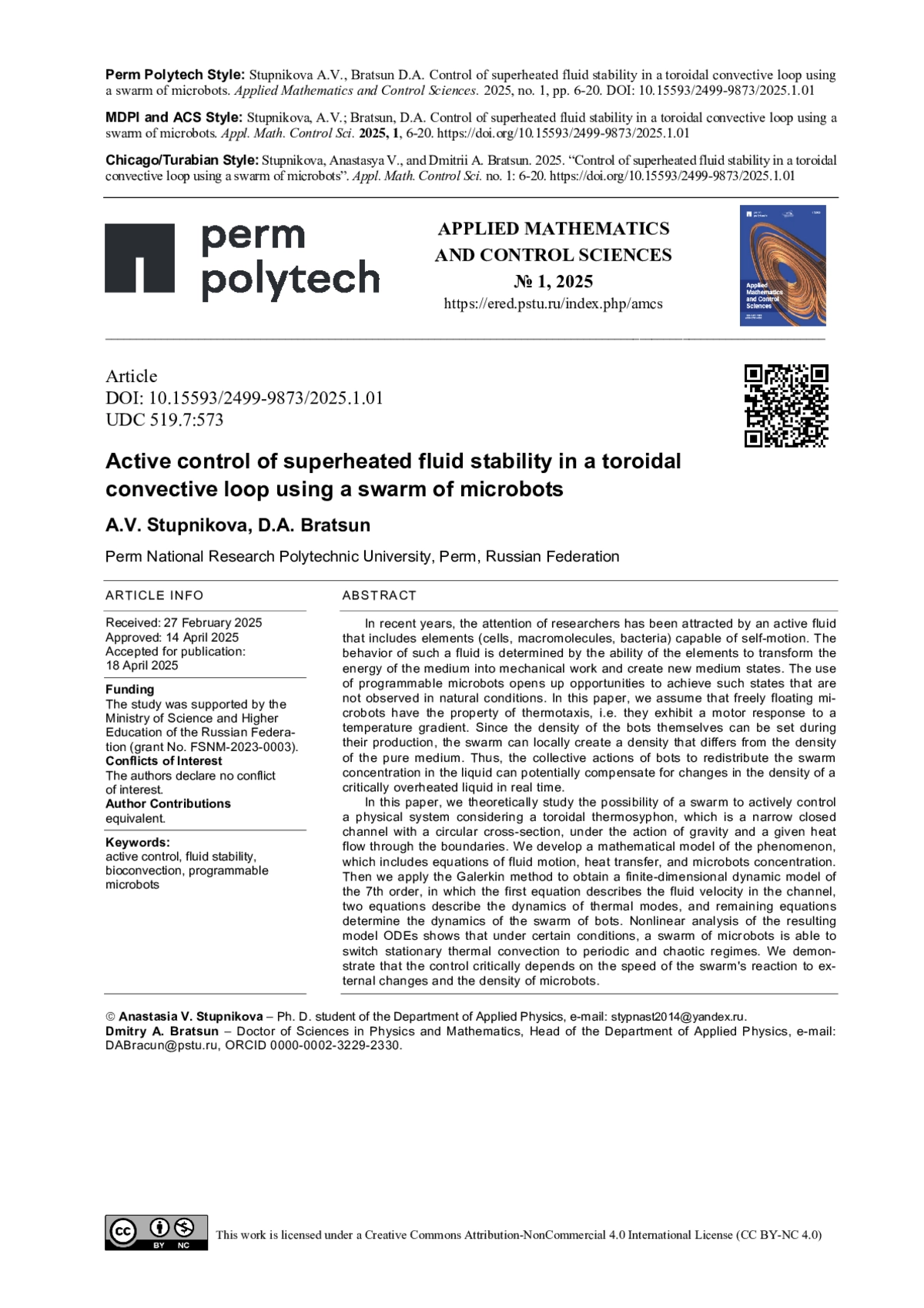 5. 	Bratsun, D.A. Delay-induced oscillations in a thermal convection loop under negative feedback control with noise / D.A. Bratsun, I.V. Krasnyakov, A.V. Zyuzgin // Commun. Nonlinear Sci. Numer. Simul. - 2017. - Vol. 47. - P. 109-126.  DOI: 10.1016/j.cnsns.2016.11.015