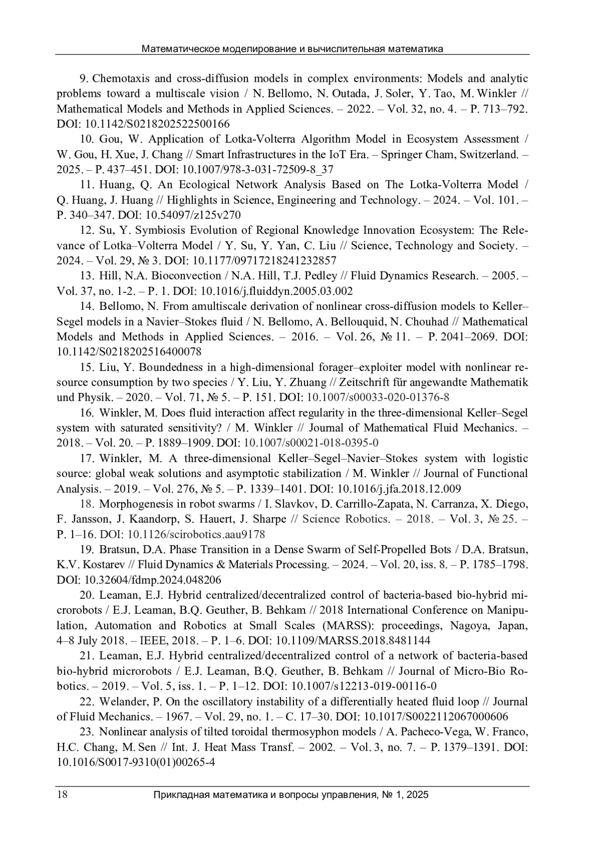 13. 	Hill, N.A. Bioconvection / N.A. Hill, T.J. Pedley // Fluid Dynamics Research. - 2005. - Vol. 37, no. 1-2. - P. 1.  DOI: 10.1016/j.fluiddyn.2005.03.002  EDN: XOZQBP