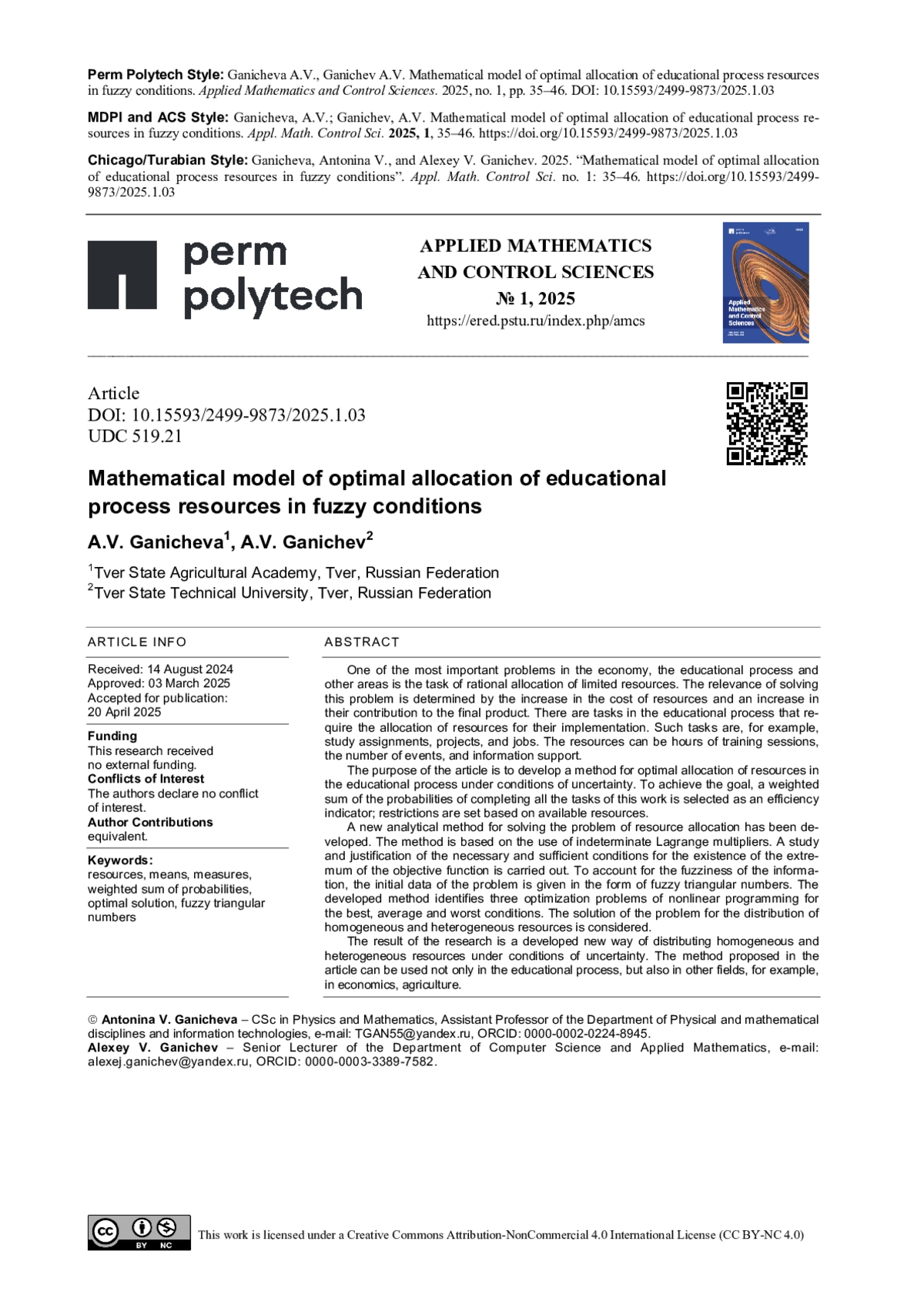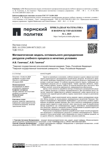 Одной из важнейших в экономике, учебном процессе и других сферах выступает задача рационального распределения ограниченных ресурсов. Актуальность решения данной проблемы определяется ростом стоимости ресурсов и увеличением их вклада в конечный продукт. В учебном процессе имеются задачи, требующие распределения ресурсов для их осуществления. Такими задачами являются, например, учебные задания, проекты, работы. В качестве ресурсов могут выступать часы учебных занятий, количество мероприятий, информационное обеспечение. Целью статьи является разработка метода оптимального распределения ресурсов в учебном процессе в условиях неопределенности. Для достижения цели в качестве показателя эффективности выбрана взвешенная сумма вероятностей выполнения всех заданий данной работы; заданы ограничения, исходя из располагаемых ресурсов. Разработан новый аналитический метод решения задачи распределения ресурсов. Метод основан на использовании неопределенных множителей Лагранжа. Проводится исследование и обоснование необходимого и достаточного условий существования экстремума целевой функции. Для учета нечеткости информации исходные данные задачи задаются в виде нечетких чисел треугольного вида. В разработанном методе выделяются три оптимизационных задачи нелинейного программирования для наилучших, средних и наихудших условий. Рассматривается решение задачи для распределения однородных и неоднородных ресурсов. Результатом исследования является разработанный новый способ распределения однородных и неоднородных ресурсов в условиях неопределенности. Предложенный в статье метод может найти применение не только в учебном процессе, но и в других областях, например, в экономике, сельском хозяйстве.