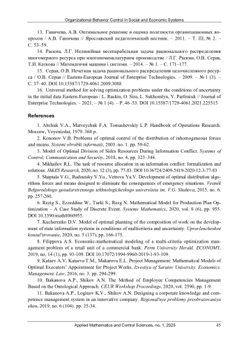 2. 	Кононов, В.Б. Задачи оптимального управления распределением неоднородных сил и средств / В.Б. Кононов // Системи обробки iнформацiї. - 2003. - № 1. - С. 59-62.