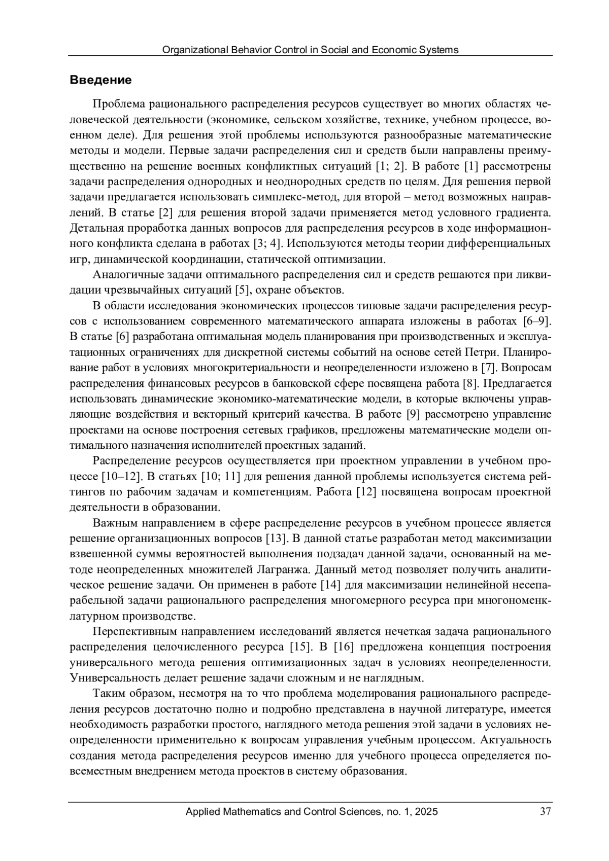 Проблема рационального распределения ресурсов существует во многих областях человеческой деятельности (экономике, сельском хозяйстве, технике, учебном процессе, военном деле). Для решения этой проблемы используются разнообразные математические методы и модели. Первые задачи распределения сил и средств были направлены преимущественно на решение военных конфликтных ситуаций [1; 2]. В работе [1] рассмотрены задачи распределения однородных и неоднородных средств по целям. Для решения первой задачи предлагается использовать симплекс-метод, для второй – метод возможных направлений. В статье [2] для решения второй задачи применяется метод условного градиента. Детальная проработка данных вопросов для распределения ресурсов в ходе информационного конфликта сделана в работах [3; 4]. Используются методы теории дифференциальных игр, динамической координации, статической оптимизации