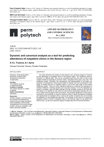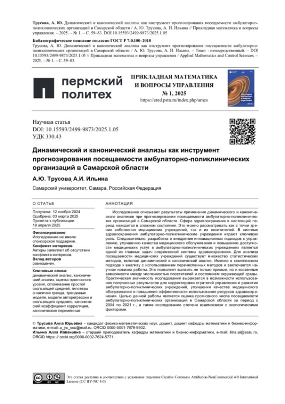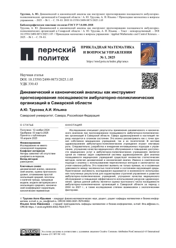 Исследование описывает результаты применения динамического и канонического анализов при прогнозировании посещаемости амбулаторно-поликлинических организаций в Самарской области. Сфера здравоохранения в настоящий период находится в сложном состоянии. Это можно рассматривать как с точки зрения собственно медицинских учреждений, так и их посетителей. В системе здравоохранения амбулаторно-поликлинические учреждения играют ключевую роль. Следовательно, разработка и внедрение инновационных подходов к управлению, улучшению качества медицинского обслуживания и повышению доступности медицинских услуг в амбулаторно-поликлинических учреждениях является одной из главных задач современной системы здравоохранения. Для анализа посещаемости медицинских учреждений существует множество статистических методов, включая динамический и канонический анализ. Именно в комплексном подходе к анализу с использованием перечисленных методов и заключается научная новизна работы. Это позволяет выявить не только прямые, но и косвенные зависимости между численностью посетителей и состоянием окружающей среды. Практическая значимость исследования выражается в возможности использования полученных результатов для корректировки стратегий управления и развития амбулаторно-поликлинических учреждений, улучшения качества медицинского обслуживания и повышения эффективности использования ресурсов здравоохранения. Целью данной работы является оценка прогнозного числа посещаемости амбулаторно-поликлинических организаций в Самарской области за период с 2004 по 2021 г., а также исследование степени взаимосвязи с экологическими факторами.