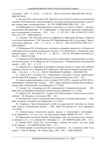 8. 	Мухачева, А. В. Математическое моделирование качества жизни населения региона / А. В. Мухачева, Е. Я. Пастухова, А. Н. Кирюхина // Вестник Омского университета. Серия: Экономика. - 2020. - Т. 18, № 1. - С. 149-161.  DOI: 10.24147/1812-3988.2020.18(1).149-161  EDN: WUUXOF
