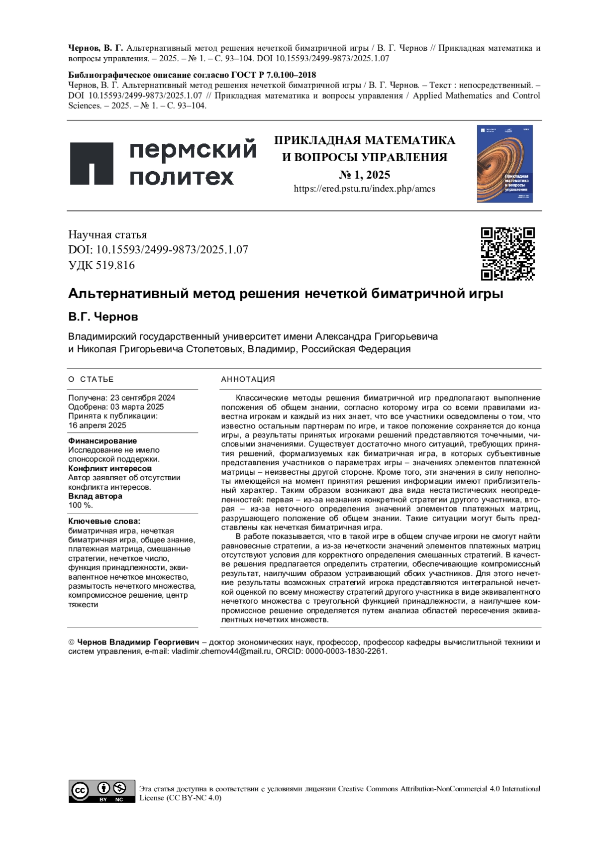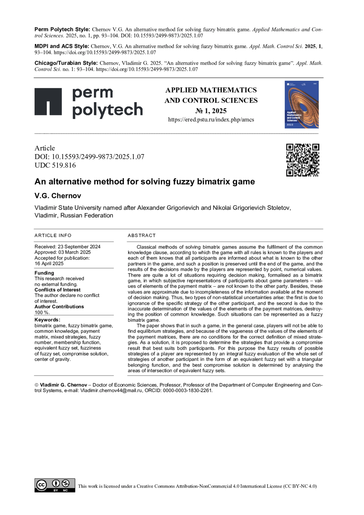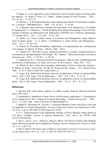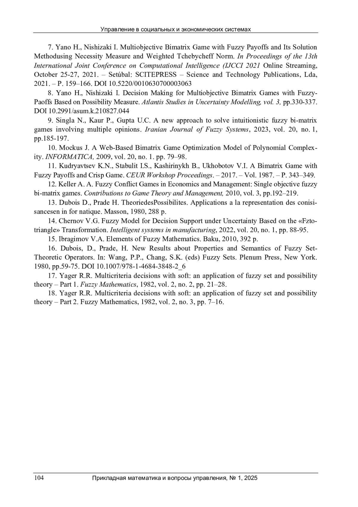 8. Yanoa, Hitoshi.Interactive Decision Making for Multiobjective Bimatrix Games with FuzzyPaoffs Based on Possibility Measure / Yanoa Hitoshi, Nishizakib Ichiro // Atlantis Studies in Uncertainty Modelling. - Vol. 3. - P. 330-337. DOI: 10.2991/asum.k.210827.044