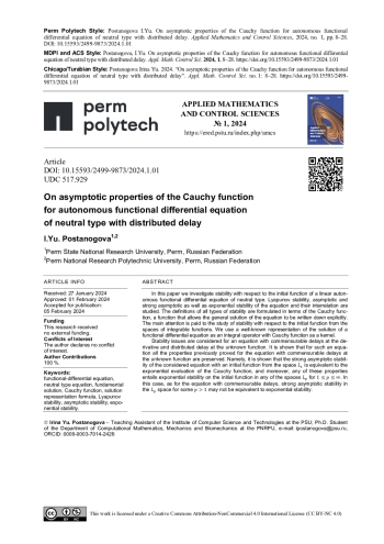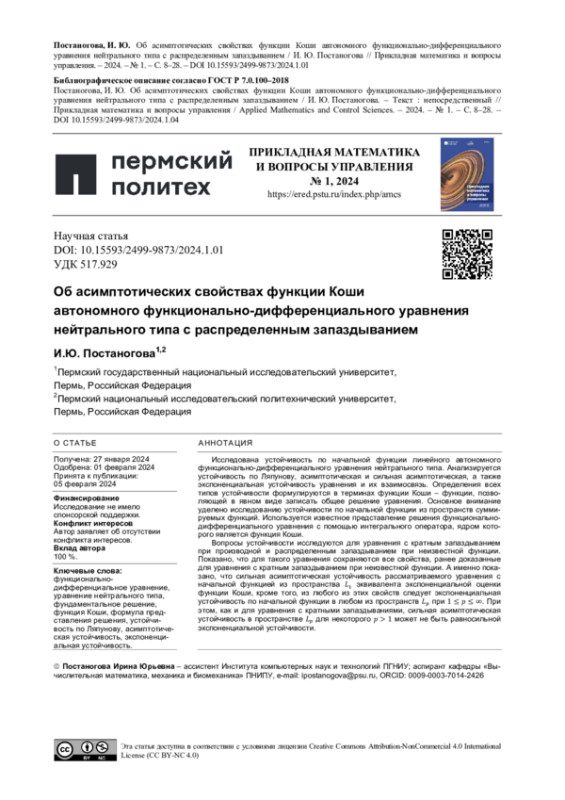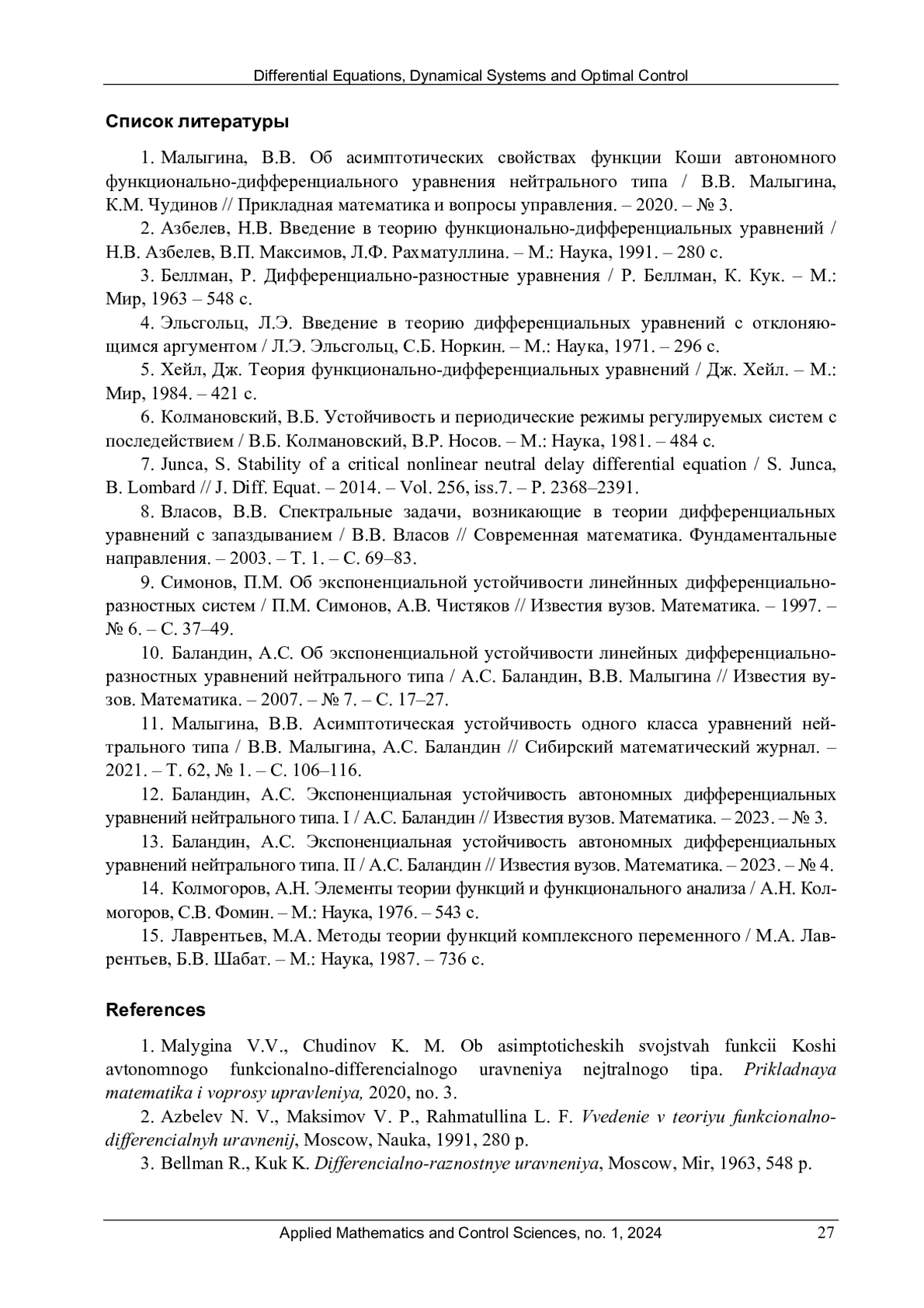 1. Малыгина, В.В. Об асимптотических свойствах функции Коши автономного функционально-дифференциального уравнения нейтрального типа / В.В. Малыгина, К.М. Чудинов // Прикладная математика и вопросы управления. - 2020. - № 3. EDN: BALLGT