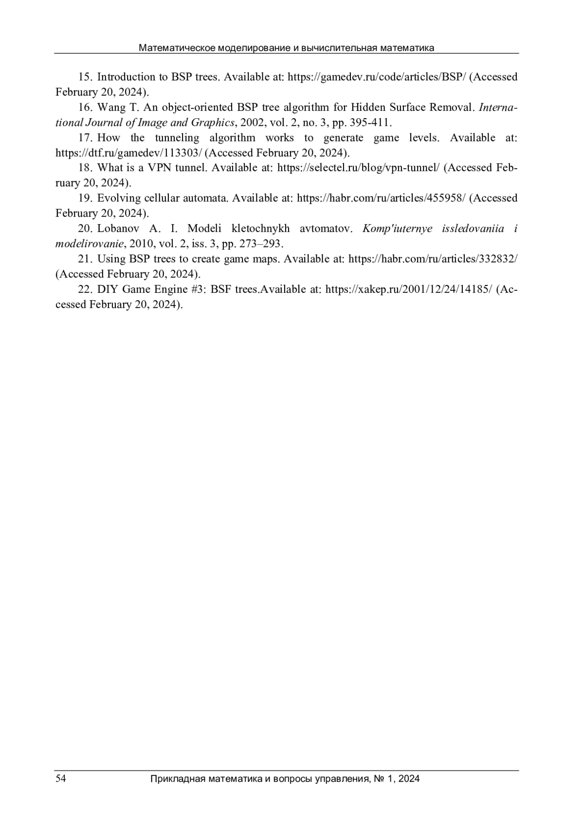 15. 	Введение в BSP деревья [Электронный ресурс]. - URL: https://gamedev.ru/code/ articles/BSP/(дата обращения: 20.02.2024).