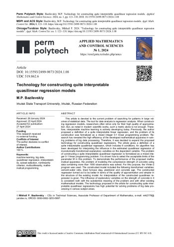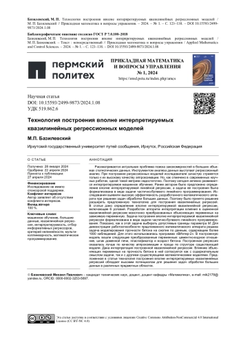 20. 	Базилевский, М.П. Сравнительный анализ эффективности методов построения вполне интерпретируемых линейных регрессионных моделей / М.П. Базилевский // Моделирование и анализ данных. - 2023. - Т. 13, № 4. - С. 59-83.  EDN: VXFGBO