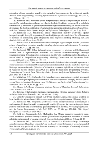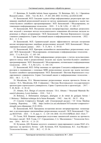 24. 	Михайлова, Н.А. Множественные регрессионные модели прочности бетона на сжатие / Н.А. Михайлова, И.В. Стефаненко // Вестник Волгоградского государственного архитектурно-строительного университета. Серия: Строительство и архитектура. - 2017. - Т. 49, № 68. - С. 30-42.  EDN: ZGRUEH