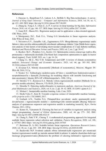 22. 	Базилевский, М.П. Отбор информативных регрессоров с учетом мультиколлинеарности между ними в регрессионных моделях как задача частично-булевого линейного программирования / М.П. Базилевский // Моделирование, оптимизация и информационные технологии. - 2018. - Т. 6, № 2 (21). - С. 104-118.  EDN: XVIYRN