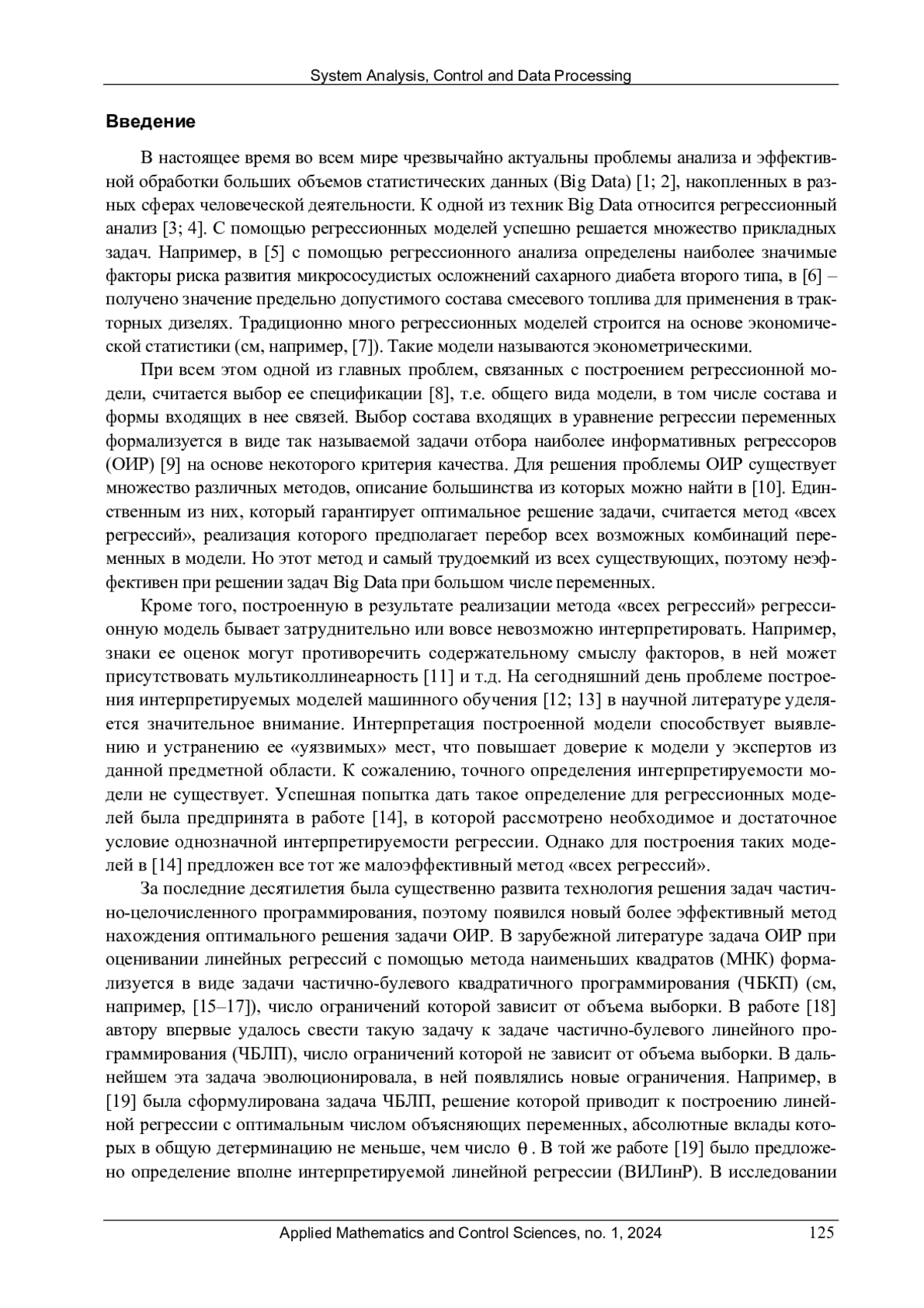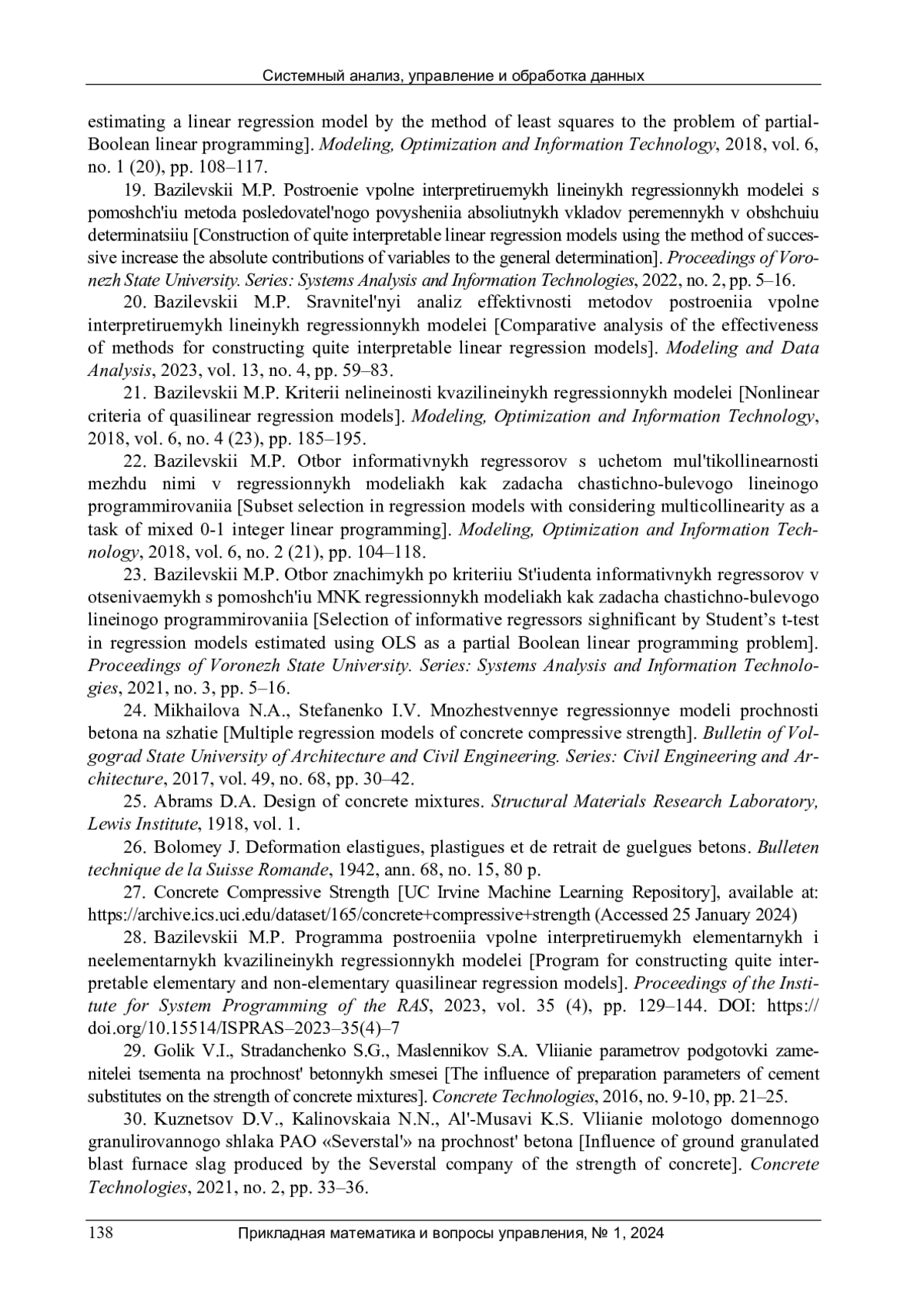 23. 	Базилевский, М.П. Отбор значимых по критерию Стьюдента информативных регрессоров в оцениваемых с помощью МНК регрессионных моделях как задача частично-булевого линейного программирования / М.П. Базилевский // Вестник Воронежского государственного университета. Серия: Системный анализ и информационные технологии. - 2021. - № 3. - С. 5-16.  EDN: EQTTZU