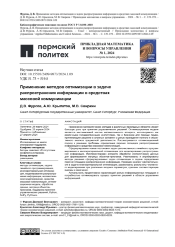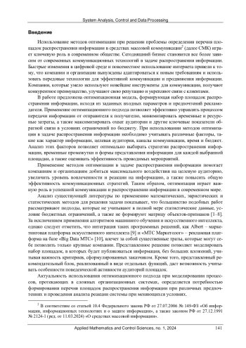 Использование методов оптимизации при решении проблемы определения перечня площадок распространения информации в средствах массовой коммуникации2 (далее СМК) играет ключевую роль в современном обществе. Сегодняшний бизнес становится все более зависим от современных коммуникационных технологий в задаче распространения информации. Быстрые изменения в цифровой среде и повсеместное использование интернета привели к тому, что компании и организации вынуждены адаптироваться к новым требованиям и использовать передовые технологии для эффективной коммуникации и продвижения информации. Компании, которые умело используют новейшие инструменты для коммуникации, получают конкурентное преимущество, улучшают свою репутацию и укрепляют связи с клиентами