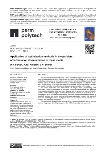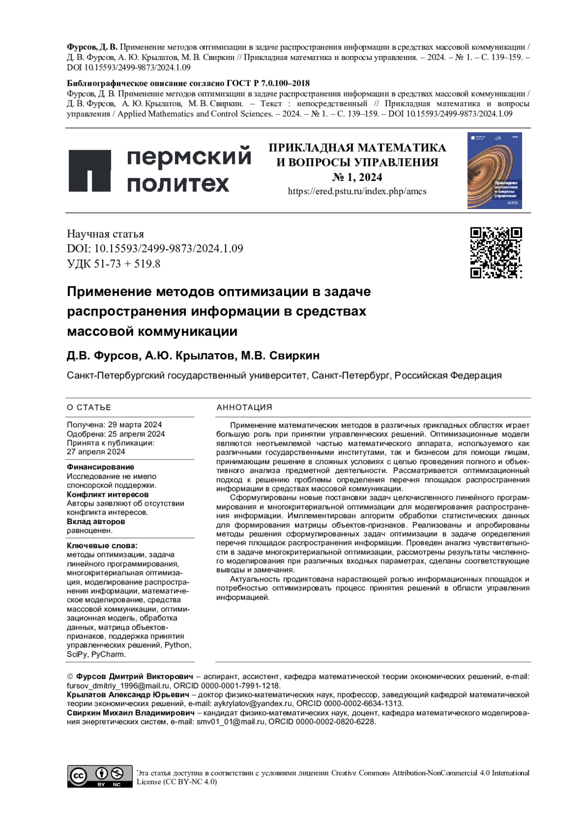 Применение математических методов в различных прикладных областях играет большую роль при принятии управленческих решений. Оптимизационные модели являются неотъемлемой частью математического аппарата, используемого как различными государственными институтами, так и бизнесом для помощи лицам, принимающим решение в сложных условиях с целью проведения полного и объективного анализа предметной деятельности. Рассматривается оптимизационный подход к решению проблемы определения перечня площадок распространения информации в средствах массовой коммуникации. Сформулированы новые постановки задач целочисленного линейного программирования и многокритериальной оптимизации для моделирования распространения информации. Имплементирован алгоритм обработки статистических данных для формирования матрицы объектов-признаков. Реализованы и апробированы методы решения сформулированных задач оптимизации в задаче определения перечня площадок распространения информации. Проведен анализ чувствительности в задаче многокритериальной оптимизации, рассмотрены результаты численного моделирования при различных входных параметрах, сделаны соответствующие выводы и замечания. Актуальность продиктована нарастающей ролью информационных площадок и потребностью оптимизировать процесс принятия решений в области управления информацией.