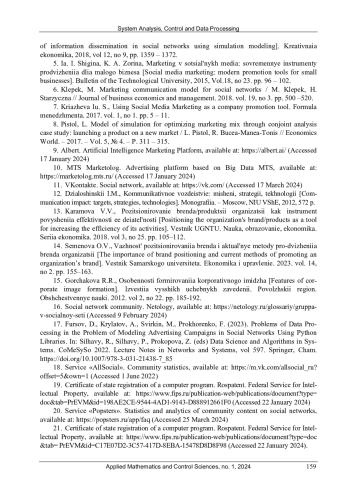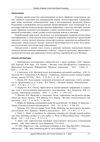 17. 	Problems of Data Processing in the Problem of Modeling Advertising Campaigns in Social Networks Using Python Libraries / D. Fursov, A. Krylatov, M. Svirkin, F. Prokhorenko // (eds) R. Silhavy, P. Silhavy, Z. Prokopova; Data Science and Algorithms in Systems.CoMeSySo 2022. - Lecture Notes in Networks and Systems. - 2023. - Vol. 597. Springer, Cham.  DOI: 10.1007/978-3-031-21438-7_85
