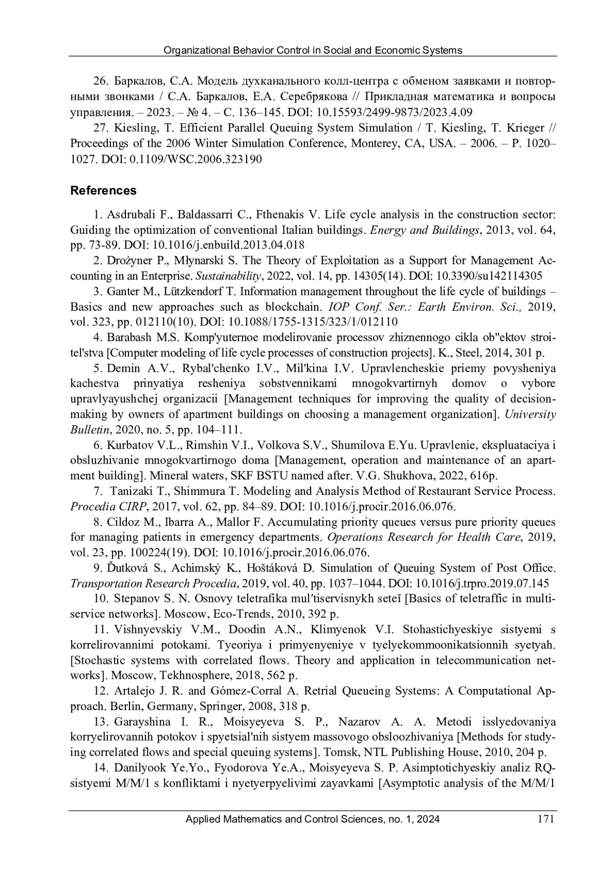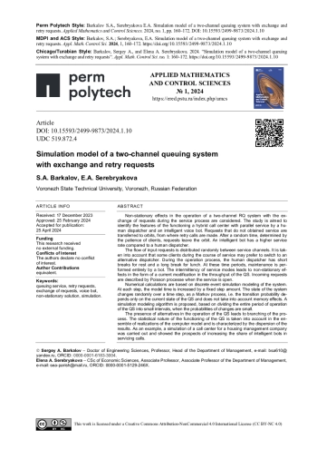26. 	Баркалов, С.А. Модель духканального колл-центра с обменом заявками и повторными звонками / С.А. Баркалов, Е.А. Серебрякова // Прикладная математика и вопросы управления. - 2023. - № 4. - С. 136-145.  DOI: 10.15593/2499-9873/2023.4.09  EDN: ZMHRKS