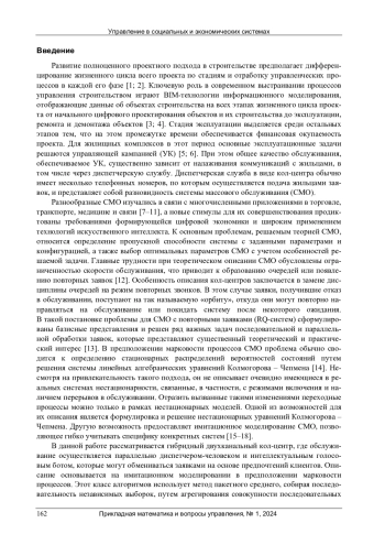 Развитие полноценного проектного подхода в строительстве предполагает дифференцирование жизненного цикла всего проекта по стадиям и отработку управленческих процессов в каждой его фазе [1; 2]. Ключевую роль в современном выстраивании процессов управления строительством играют BIM-технологии информационного моделирования, отображающие данные об объектах строительства на всех этапах жизненного цикла проекта от начального цифрового проектирования объектов и их строительства до эксплуатации, ремонта и демонтажа объектов [3; 4]. Стадия эксплуатации выделяется среди остальных этапов тем, что на этом промежутке времени обеспечивается финансовая окупаемость проекта. Для жилищных комплексов в этот период основные эксплуатационные задачи решаются управляющей кампанией (УК) [5; 6]. При этом общее качество обслуживания, обеспечиваемое УК, существенно зависит от налаживания коммуникаций с жильцами, в том числе через диспетчерскую службу. Диспетчерская служба в виде кол-центра обычно имеет несколько телефонных номеров, по которым осуществляется подача жильцами заявок, и представляет собой разновидность системы массового обслуживания (СМО)