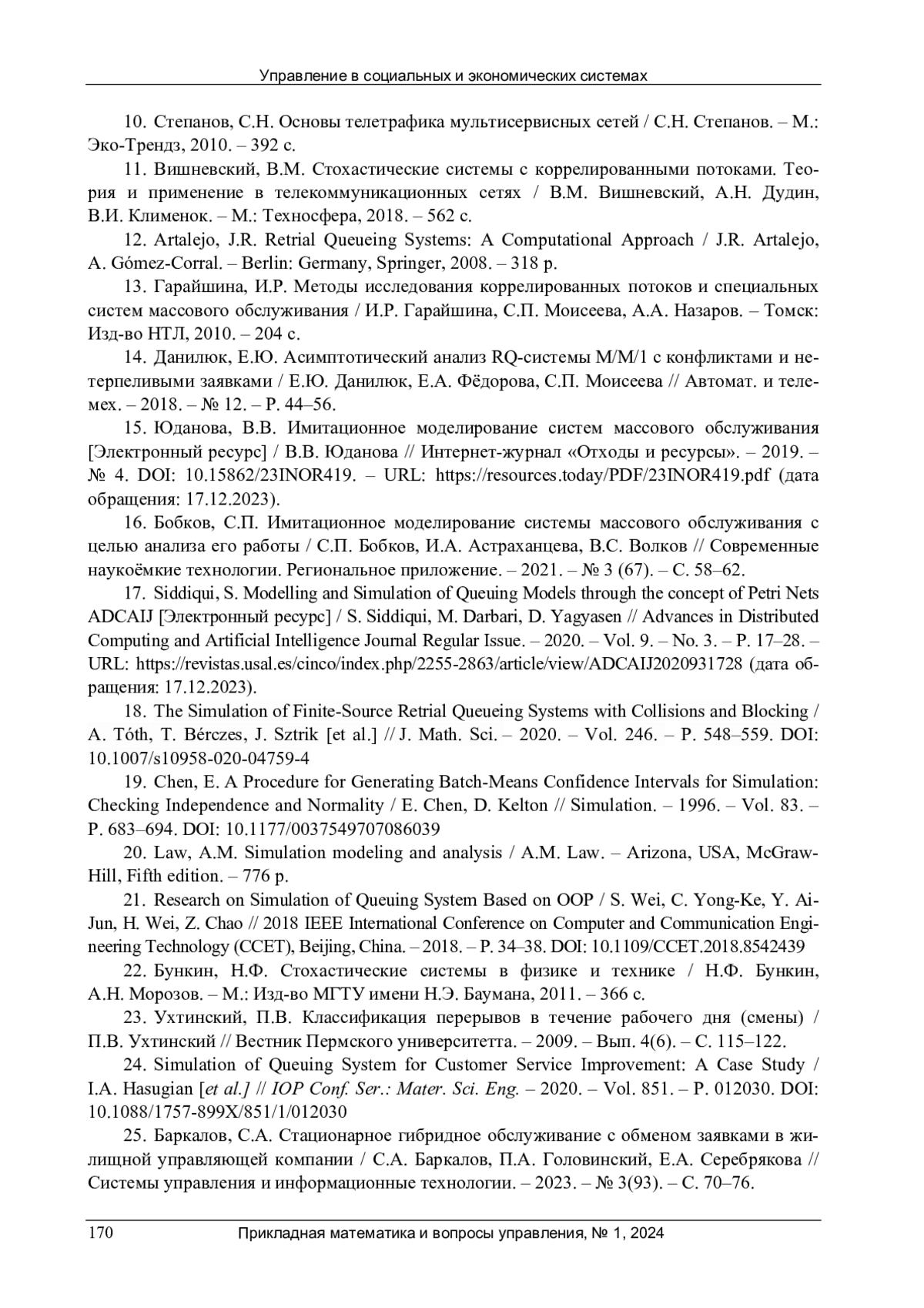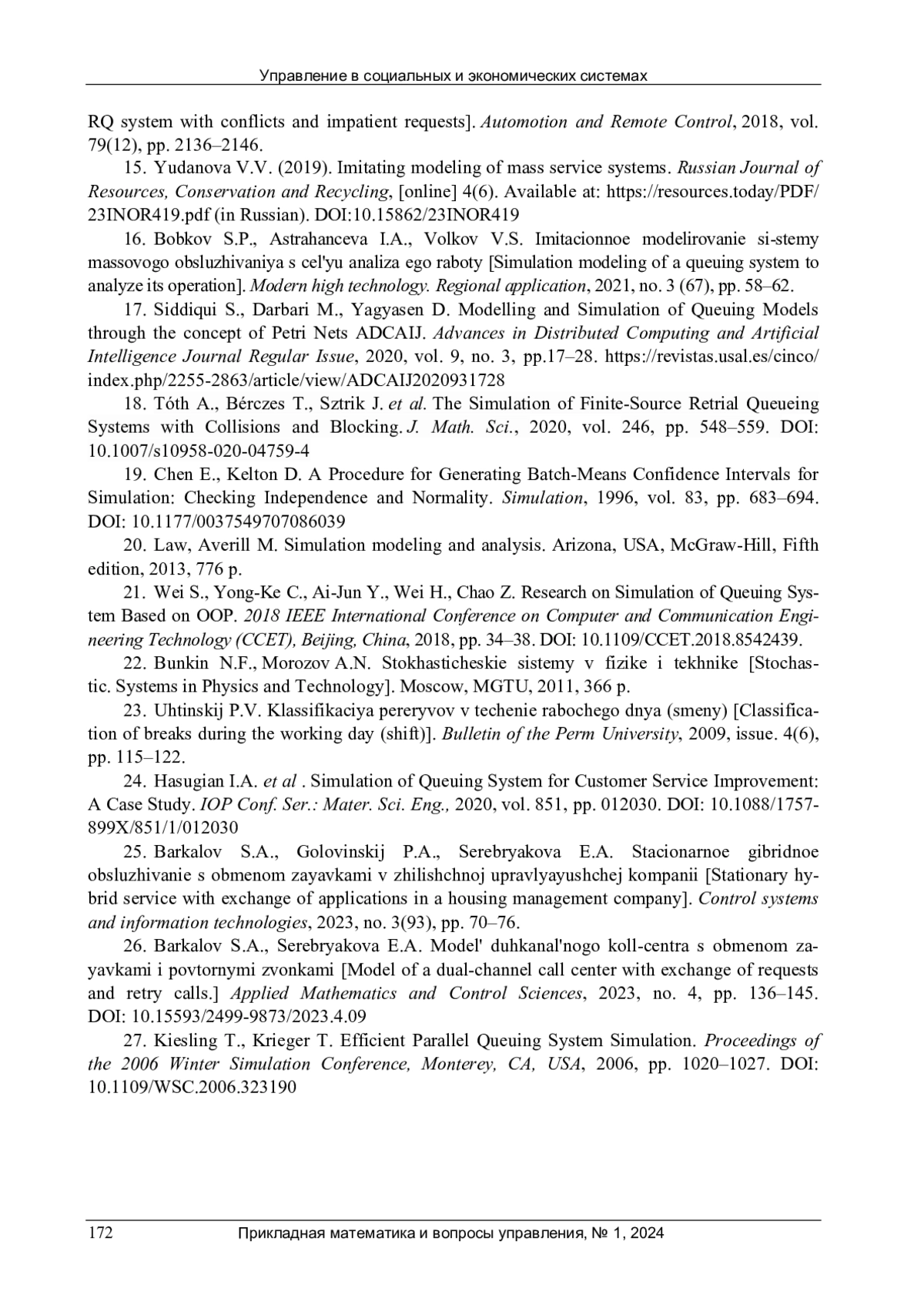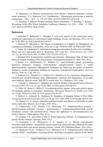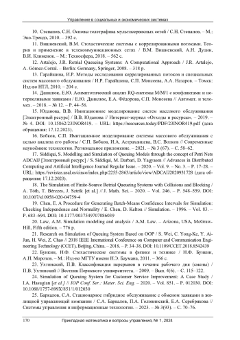 15. 	Юданова, В.В. Имитационное моделирование систем массового обслуживания [Электронный ресурс] / В.В. Юданова // Интернет-журнал “Отходы и ресурсы”. - 2019. - № 4. 10.15862/23INOR419. - URL: https://resources.today/PDF/23INOR419.pdf (дата обращения: 17.12.2023).  DOI: 10.15862/23INOR419.-URL  EDN: VFAGFX