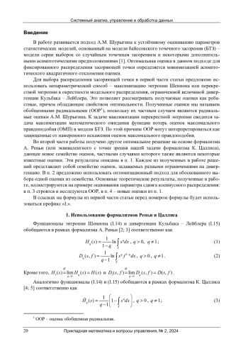 Рассматривается развитие теории робастного оценивания параметров статистических моделей с привлечением аппарата теории информации. Анализируется подход А. М. Шурыгина, основанный на модели серии выборок со случайным точечным засорением (модели байесовского точечного засорения). В первой части нашей работы описан непараметрический способ выбора распределения засоряющей точки - посредством максимизации энтропии Шеннона или перекрестной энтропии в окрестности модельного распределения, ограниченной величиной дивергенции Кульбака - Лейблера. Такой способ нахождения плотности распределения засоряющей точки позволяет рассматривать получаемые оценки как робастные, причем обладающие свойством оптимальности. Полученные оценки мы называем обобщенными радикальными, поскольку их частным случаем являются радикальные оценки А. М. Шурыгина. Во второй части работы получено другое оптимальное решение на основе формализма А. Реньи (или эквивалентного с точки зрения нашей задачи формализма К. Цаллиса), дающее новое семейство оценок, частными случаями которого также являются некоторые известные оценки. Для выбора одной оценки из семейства, определяемого разными ограничениями на дивергенцию, предложен оптимизационный подход. Основные теоретические результаты, полученные в работе, иллюстрируются на примере оценивания параметра сдвига косинусного распределения.