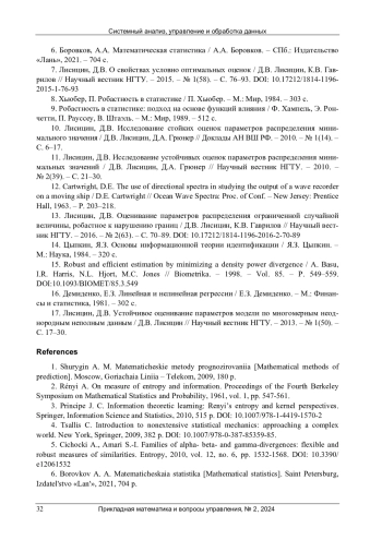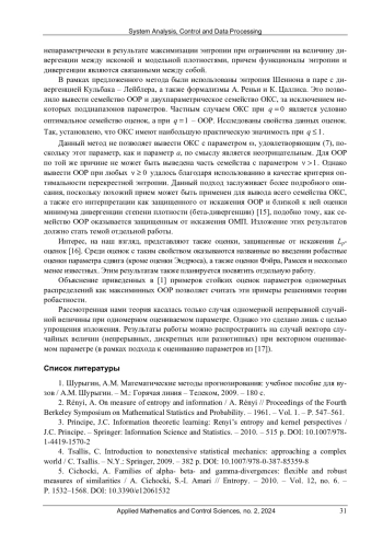 2. 	Rényi, A. On measure of entropy and information / A. Rényi // Proceedings of the Fourth Berkeley Symposium on Mathematical Statistics and Probability. - 1961. - Vol. 1. - P. 547-561.
