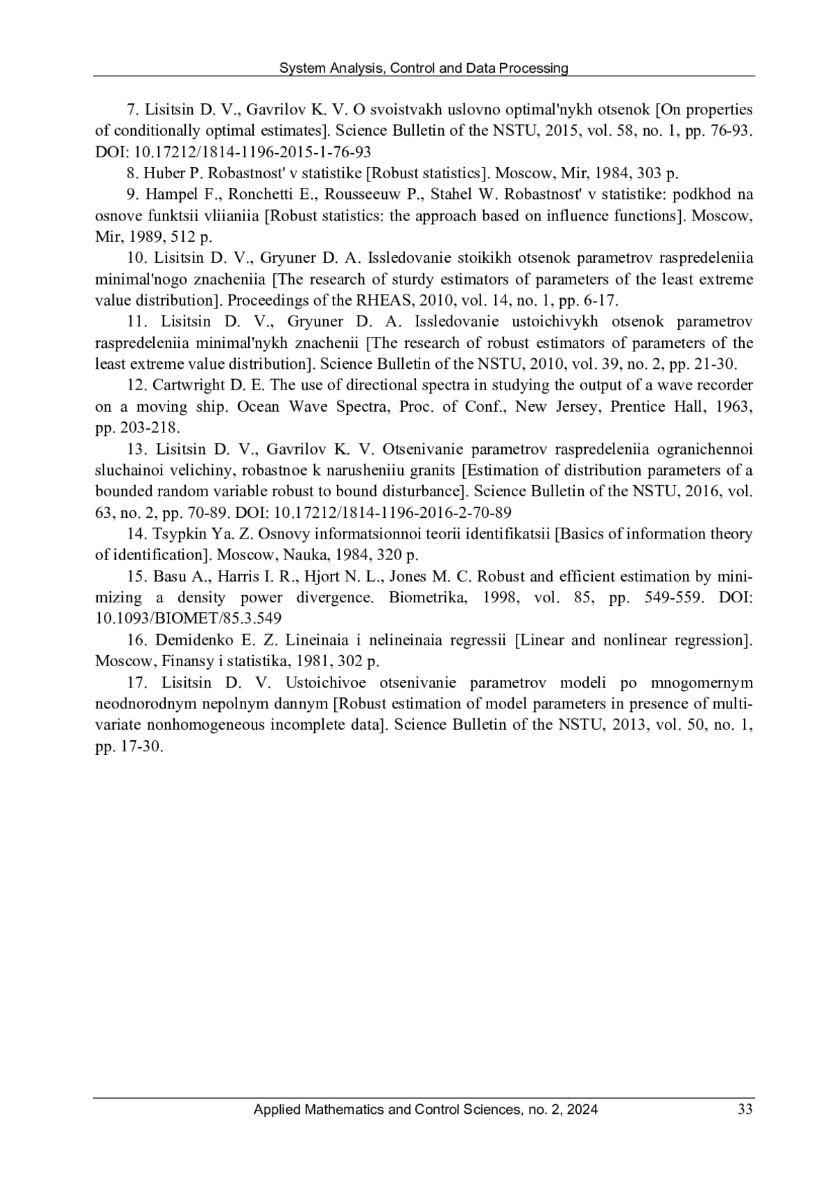 17. 	Лисицин, Д.В. Устойчивое оценивание параметров модели по многомерным неоднородным неполным данным / Д.В. Лисицин // Научный вестник НГТУ. - 2013. - № 1(50). - С. 17-30.  EDN: PWURSH