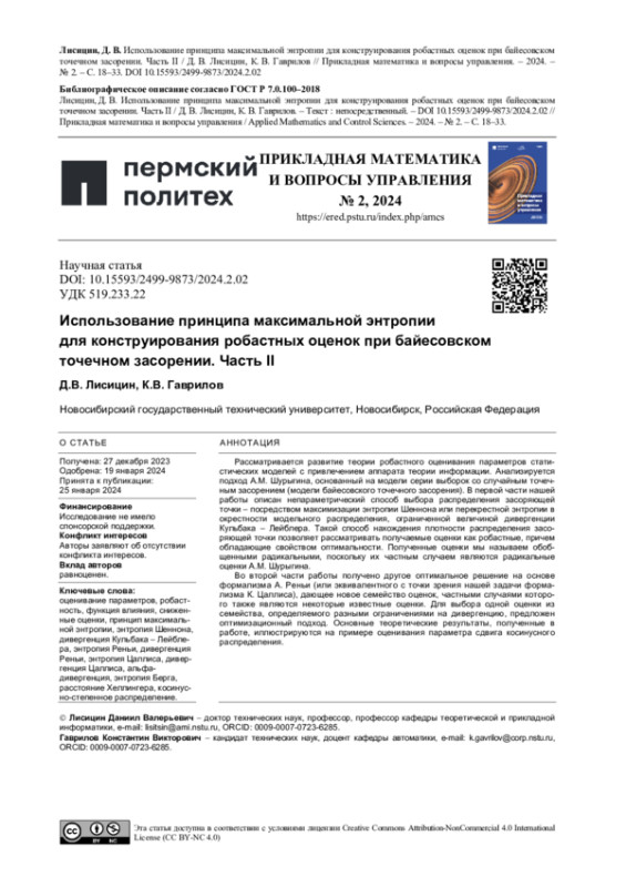 7. 	Лисицин, Д.В. О свойствах условно оптимальных оценок / Д.В. Лисицин, К.В. Гаврилов // Научный вестник НГТУ. - 2015. - № 1(58). - С. 76-93.  DOI: 10.17212/1814-1196-2015-1-76-93  EDN: TZGXLP