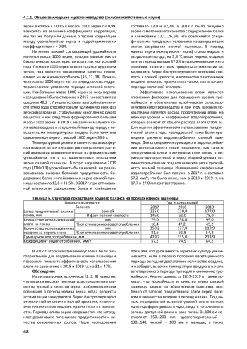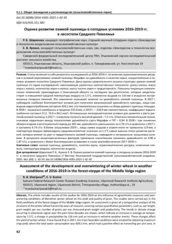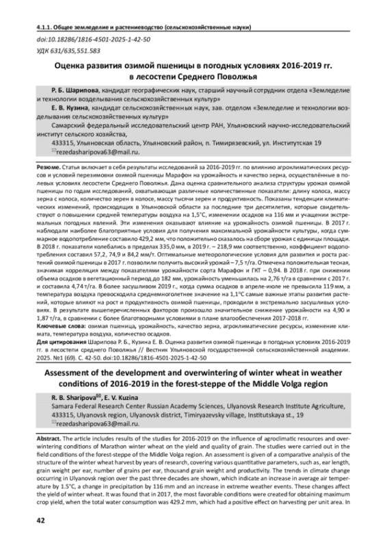 Статья включает в себя результаты исследований за 2016-2019 гг. по влиянию агроклиматических ресурсов и условий перезимовки озимой пшеницы Марафон на урожайность и качество зерна, осуществлённые в полевых условиях лесостепи Среднего Поволжья. Дана оценка сравнительного анализа структуры урожая озимой пшеницы по годам исследований, охватывающая различные количественные показатели: длину колоса, массу зерна с колоса, количество зерен в колосе, массу тысячи зерен и продуктивность. Показаны тенденции климатических изменений, происходящих в Ульяновской области за последние три десятилетия, которые свидетельствуют о повышении средней температуры воздуха на 1,5°С, изменении осадков на 116 мм и учащении экстремальных погодных явлений. Эти изменения оказывают влияние на урожайность озимой пшеницы. В 2017 г. наблюдали наиболее благоприятные условия для получения максимальной урожайности культуры, когда суммарное водопотребление составило 429,2 мм, что положительно сказалось на сборе урожая с единицы площади. В 2018 г. показатели колебались в пределах 335,0 мм, в 2019 г. - 218,9 мм соответственно, коэффициент водопотребления составил 57,2, 74,9 и 84,2 мм/т. Оптимальные метеорологические условия для развития и роста растений озимой пшеницы в 2017 г. позволили получить высокий урожай - 7,5 т/га. Отмечена положительная тесная, значимая корреляция между показателями урожайности сорта Марафон и ГКТ - 0,94. В 2018 г. при снижении объема осадков в вегетационный период до 182 мм, урожайность уменьшилась на 2,76 т/га в сравнении с 2017 г. и составила 4,74 т/га. В более засушливом 2019 г., когда сумма осадков в апреле-июле не превысила 119 мм, а температура воздуха превосходила среднемноголетнее значение на 1,1оС самые важные этапы развития растений, которые влияют на рост и продуктивность озимой пшеницы, проходили в экстремально засушливых условиях. В результате вышеперечисленных факторов произошло значительное снижение урожайности на 4,90 и 1,87 т/га, в сравнении с более благотворными условиями в плане влагообеспечения 2017-2018 гг.
