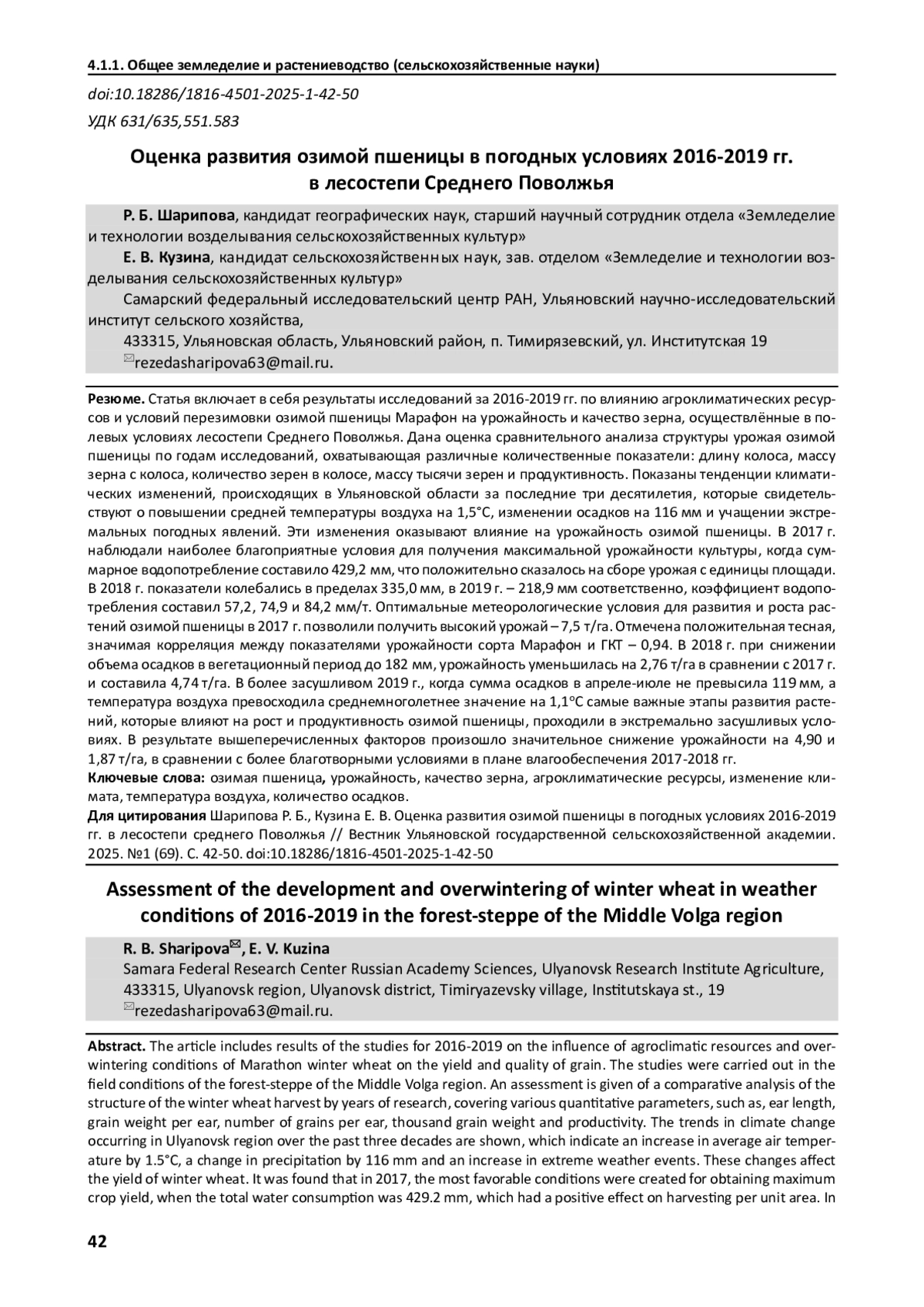 11. Оценка агроклиматических ресурсов и урожайности яровой пшеницы в Республике Татарстан / В. Н. Павлова, Ю. П. Переведенцев, А. А. Караченкова и др. // Метеорология и гидрология. 2023. №1. С. 77-90. EDN: HNAHVO