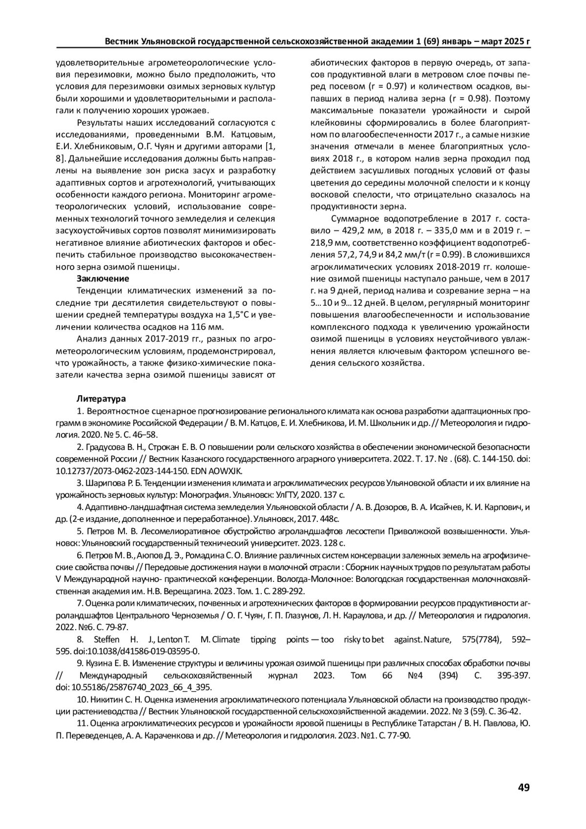 10. Никитин С. Н. Оценка изменения агроклиматического потенциала Ульяновской области на производство продукции растениеводства // Вестник Ульяновской государственной сельскохозяйственной академии. 2022. № 3 (59). С. 36-42. EDN: LSBPDS