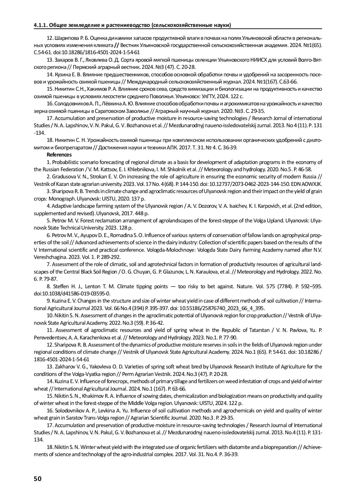 12. Шарипова Р. Б. Оценка динамики запасов продуктивной влаги в почвах на полях Ульяновской области в региональных условиях изменения климата // Вестник Ульяновской государственной сельскохозяйственная академия. 2024. №1(65). С.54-61. DOI: 10.18286/1816-4501-2024-1-54-61