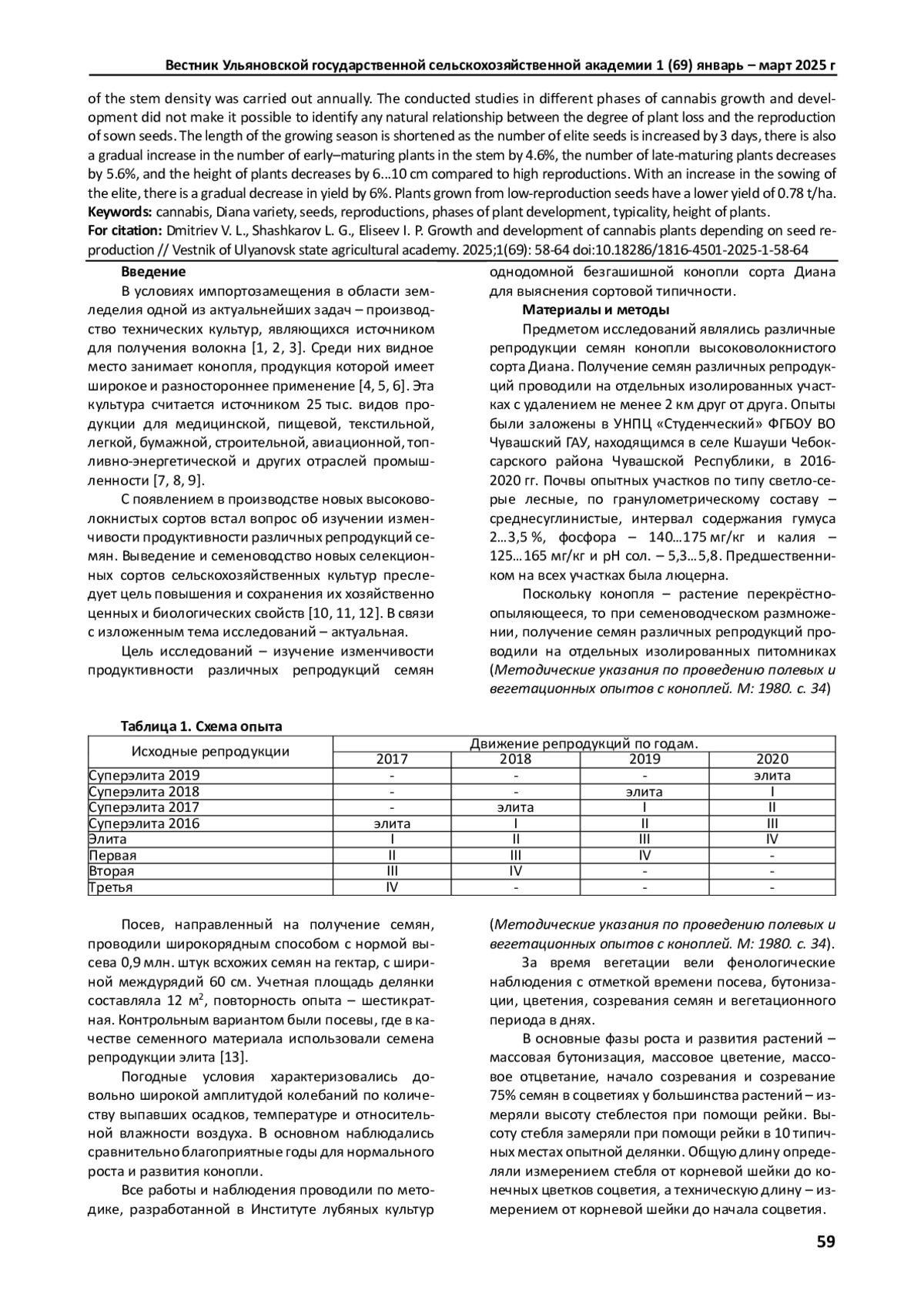 3. 	Димитриев В. Л., Шашкаров Л. Г., Яковлева М. И. Сравнительная оценка некоторых морфолого-анатомических особенностей стеблей гибридов двудомных сортов коноплис однодомными // Пермский аграрный вестник. 2021. № 4(36). С. 38-45. DOI: 10.47737/2307-2873_2021_36_38 EDN: BPDIFE