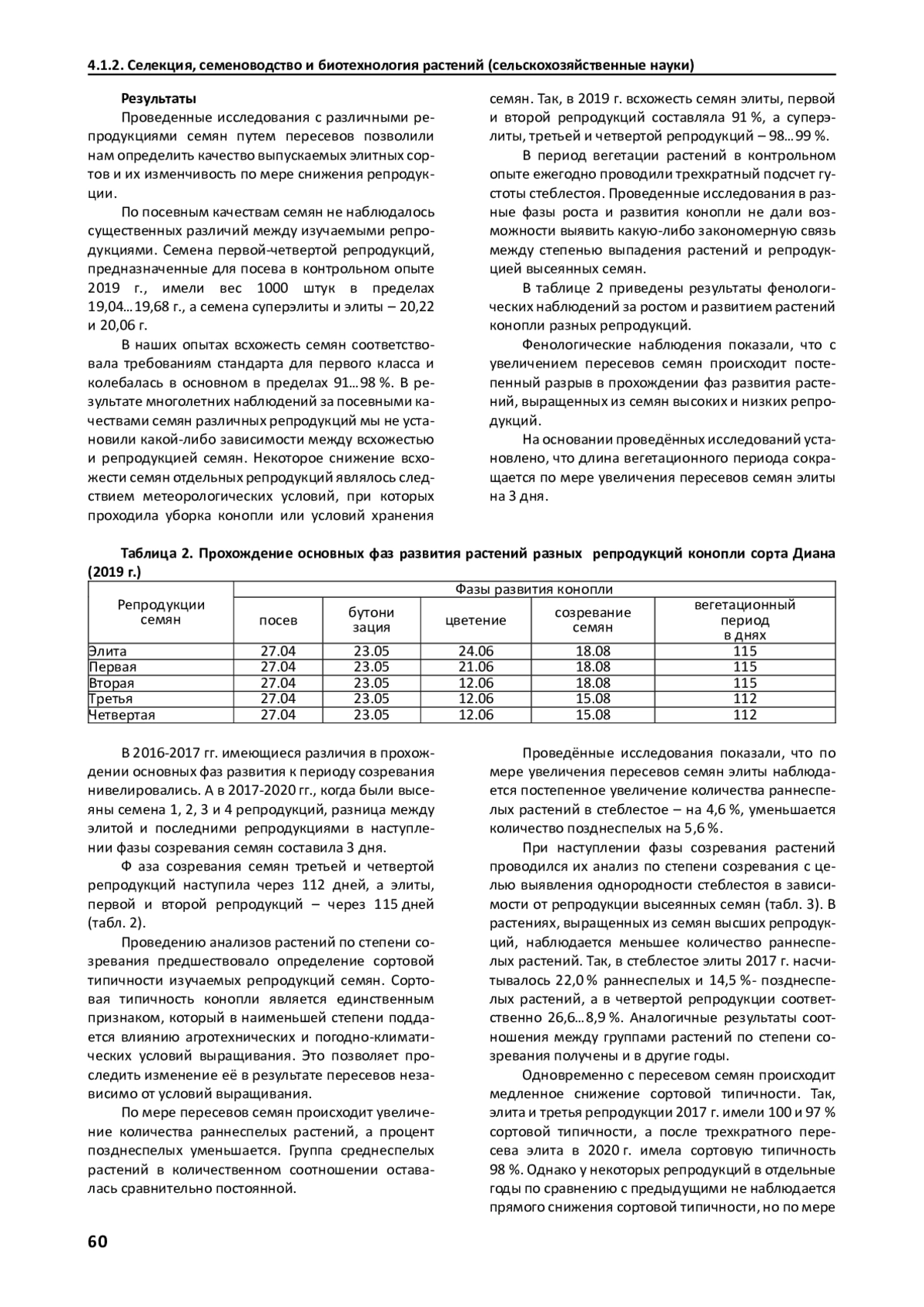 Исследования проводили с целью изучения изменчивости продуктивности различных репродукций семян однодомной безгашишной конопли сорта Диана. Предметом исследований являлись различные репродукции семян высоковолокнистого сорта Диана. Опыты были заложены в Чувашской Республике. Почва участка -серые лесные почвы. Посев проводили широкорядным способом с нормой высева 0,9 млн. штук всхожих семян на гектар. Учетная площадь делянки составляла 12 м2, повторность опыта - шестикратная. Контрольным вариантом являлась репродукция элита. Проведенные исследования с различными репродукциями семян путем пересевов позволили нам определить качество выпускаемых элитных сортов и их изменчивость по мере снижения репродукции. Семена первой-четвертой репродукций, предназначенные для посева в контрольном опыте 2019 г., имели вес 1000 штук в пределах 19,04…19,68 г., а семена суперэлиты и элиты - 20,22 и 20,06 г. Всхожесть семян соответствовала требованиям стандарта для первого класса и колебалась в основном в пределах 91.98 %. В результате многолетних наблюдений за посевным качеством семян различных репродукций мы не установили какой-либо зависимости между всхожестью и репродукцией. В период вегетации растений в контрольном опыте ежегодно проводили трехкратный подсчет густоты стеблестоя. Проведенные исследования в разные фазы роста и развития конопли не дали возможности выявить какую-либо закономерную связь между степенью выпадения растений и репродукцией высеянных семян. Длина вегетационного периода сокращается по мере увеличения пересевов семян элиты на 3 дня, наблюдается также постепенное увеличение количества раннеспелых растений в стеблестое - на 4,6%, уменьшается количество позднеспелых на 5,6 %, снижается высота растений по сравнению с высокими репродукциями на 6.10 см. С увеличением пересевов элиты наблюдается постепенное уменьшение урожайности на 6 %. Растения, выращенные из семян низких репродукций, характеризуются меньшей урожайностью 0,78 т/га.