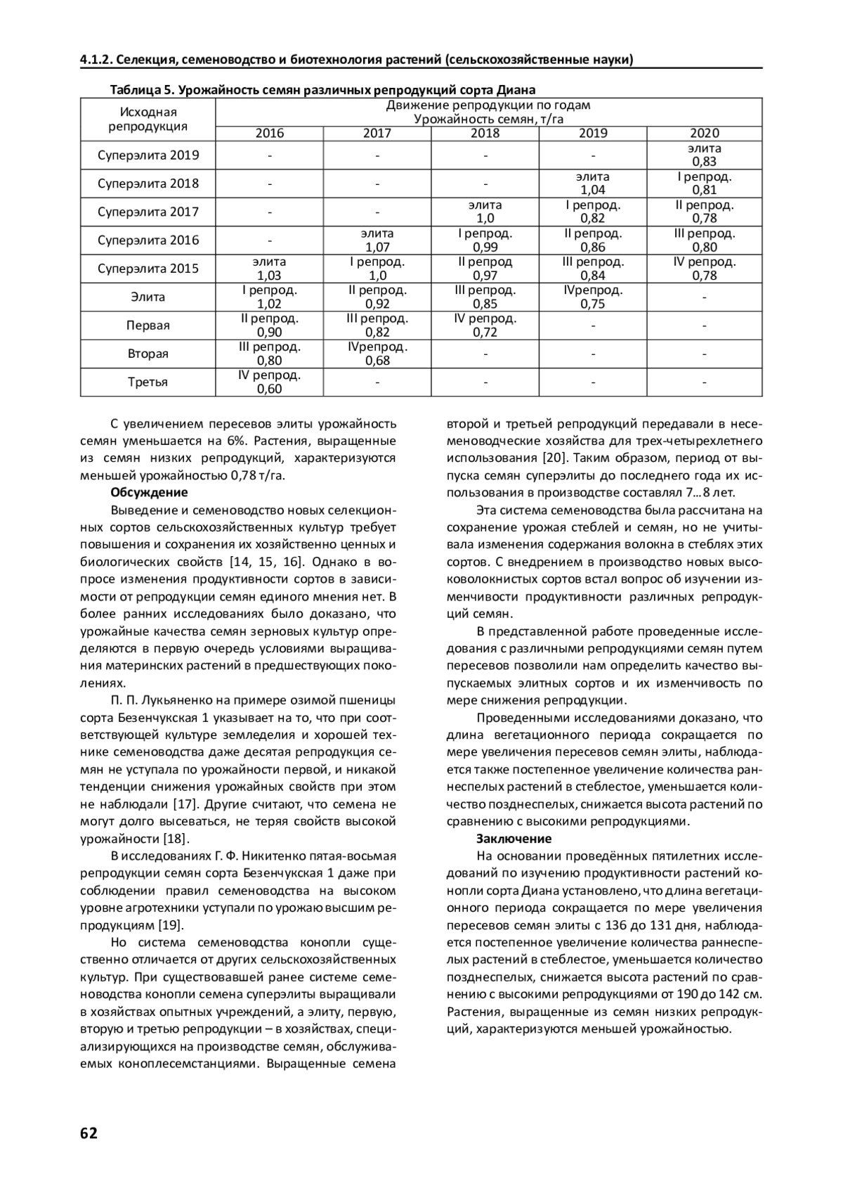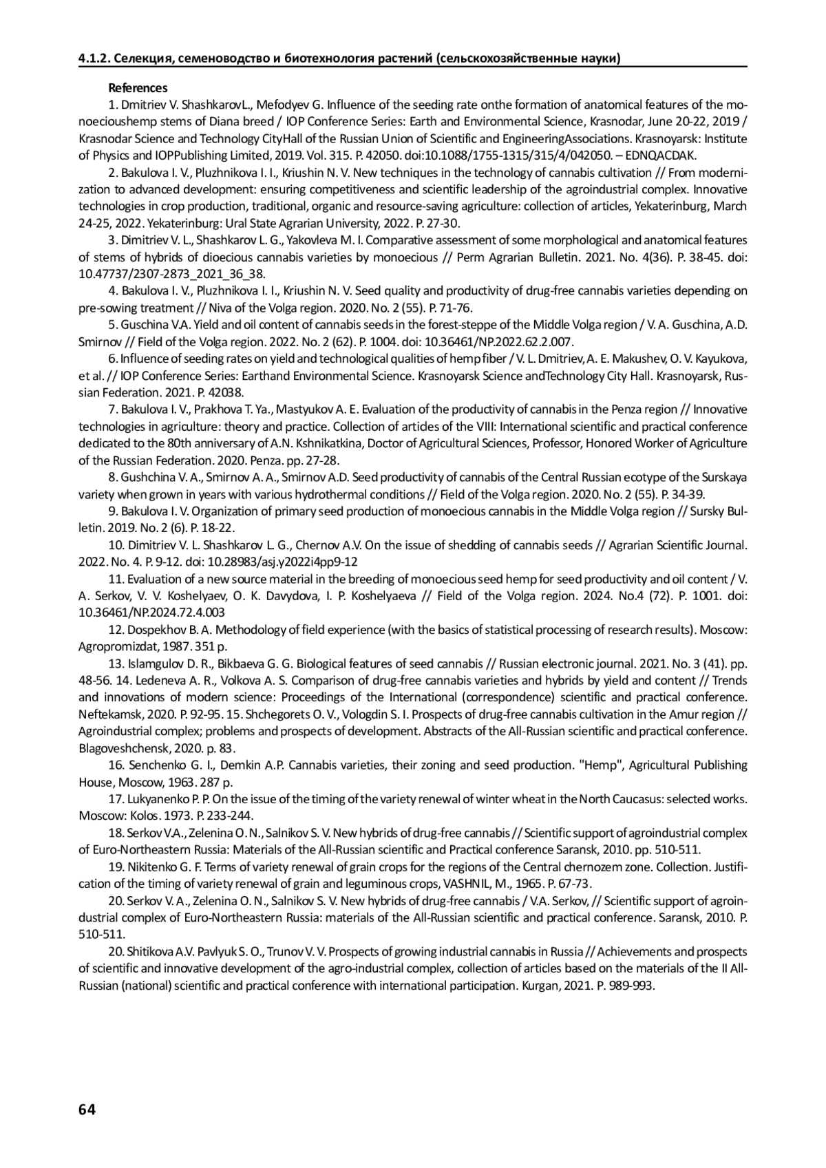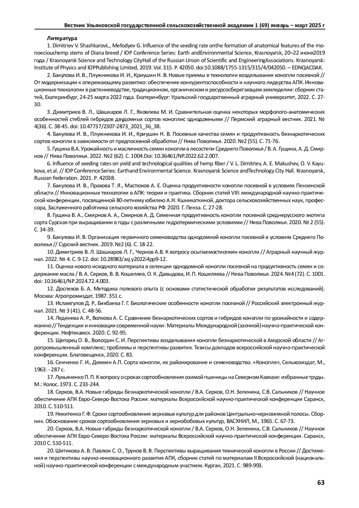 5. 	Гущина В.А. Урожайность и масличность семян конопли в лесостепи Среднего Поволжья / В. А. Гущина, А. Д. Смирнов // Нива Поволжья. 2022. №2 (62). С. 1004. DOI: 10.36461/NP.2022.62.2.007 EDN: WLHLIB