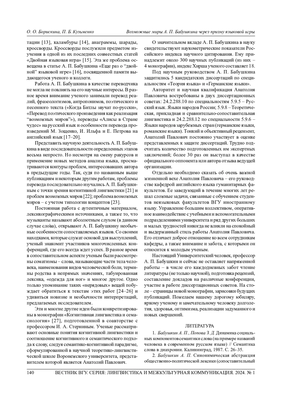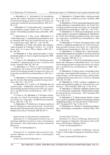 16. 	Бабушкин А. П. Еще раз о “двойной” языковой игре // Филология на стыке научных эпох: сб. ст. пам. д-ра филол. наук, проф. Анатолия Михайловича Ломова. Воронеж, 2020. С. 48-57.