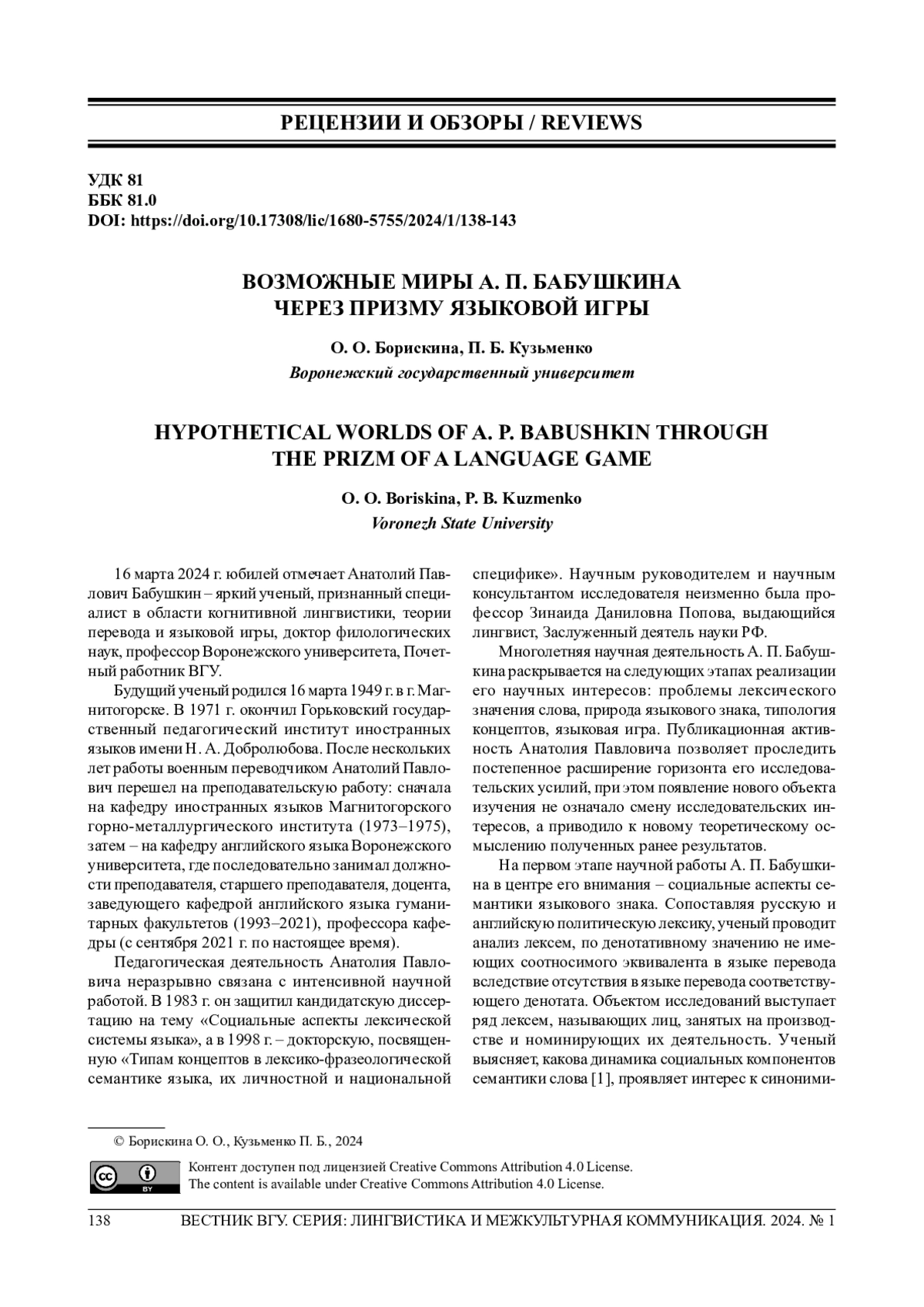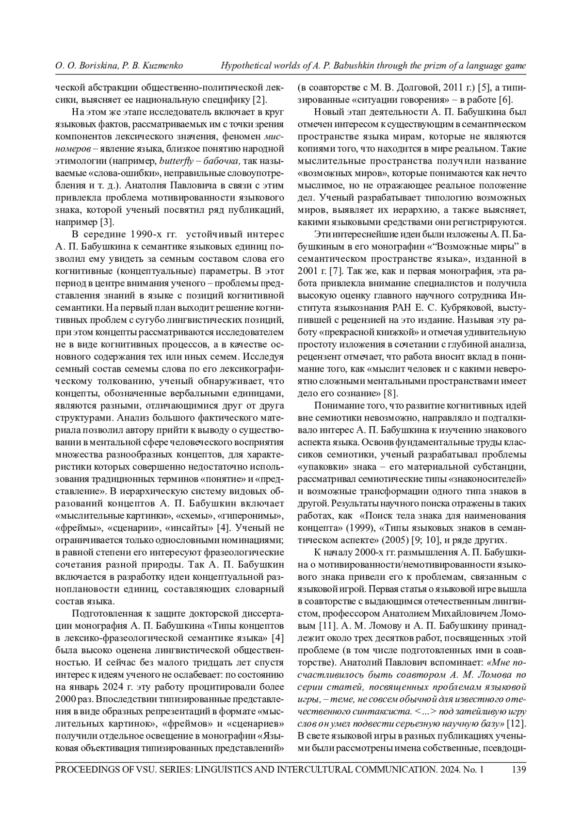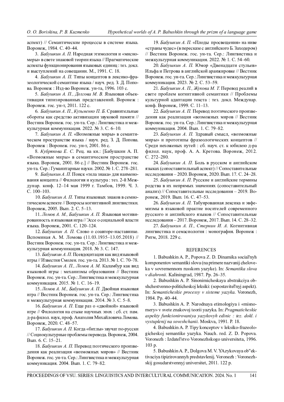 15. 	Ломов А. М., Бабушкин А. П. Двойная языковая игра // Вестник Воронеж. гос. ун-та. Сер.: Лингвистика и межкультурная коммуникация. 2014. № 3. С. 5-8. EDN: SMELTZ