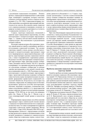 Изучение лингвистической интерференции привлекает внимание ученых в течение многих десятилетий, существуют разные взгляды и подходы к изучению данного явления. До настоящего времени интерференция изучалась главным образом с социолингвистической, психолингвистической и лингводидактической точек зрения в контексте проблем билингвизма, заимствований, неологизации, перевода и изучения иностранных языков. Опираясь на последние тенденции развития лингвистики, данное исследование рассматривает лингвистическую интерференцию как социокогнитивное явление, т. е. как процесс трансфера, распространения и трансформации структур знаний, обусловленный переходом из одного социума в другой. Целью данной работы является разработка и построение модели социально обусловленной структуры знаний, которая подвергается передаче и изменению в процессе интерференции. Исходной точкой для построения социокогнитивной модели интерференции является модель «семиотического треугольника» У. Крофта, который выделяет форму, значение и социум, подчеркивая, что отношение «форма - значение» разделяется членами общества и основывается на конвенции. В исследовании показано, что лингвистическая интерференция не представляет собой исключительно механистический процесс обмена знаниями, а предполагает запуск процессов переосмысления реальности, сопровождающийся трансформациями социокогнитивных структур. Социокогнитивные модели, лежащие в основе семантики слов, включают в себя как знания о мире (природном мире и мире артефактов), так и знания о языке, при этом обусловлены спецификой соответствующей лингвокультуры. Следовательно, способ, которым социокогнитивные модели скрепляют между собой форму и значение, определяется точкой зрения (перспективой), задаваемой социальными практиками и общественным устройством. При переходе из одного социума в другой происходит смещение перспективы, которая сопровождается сменой фокуса внимания.