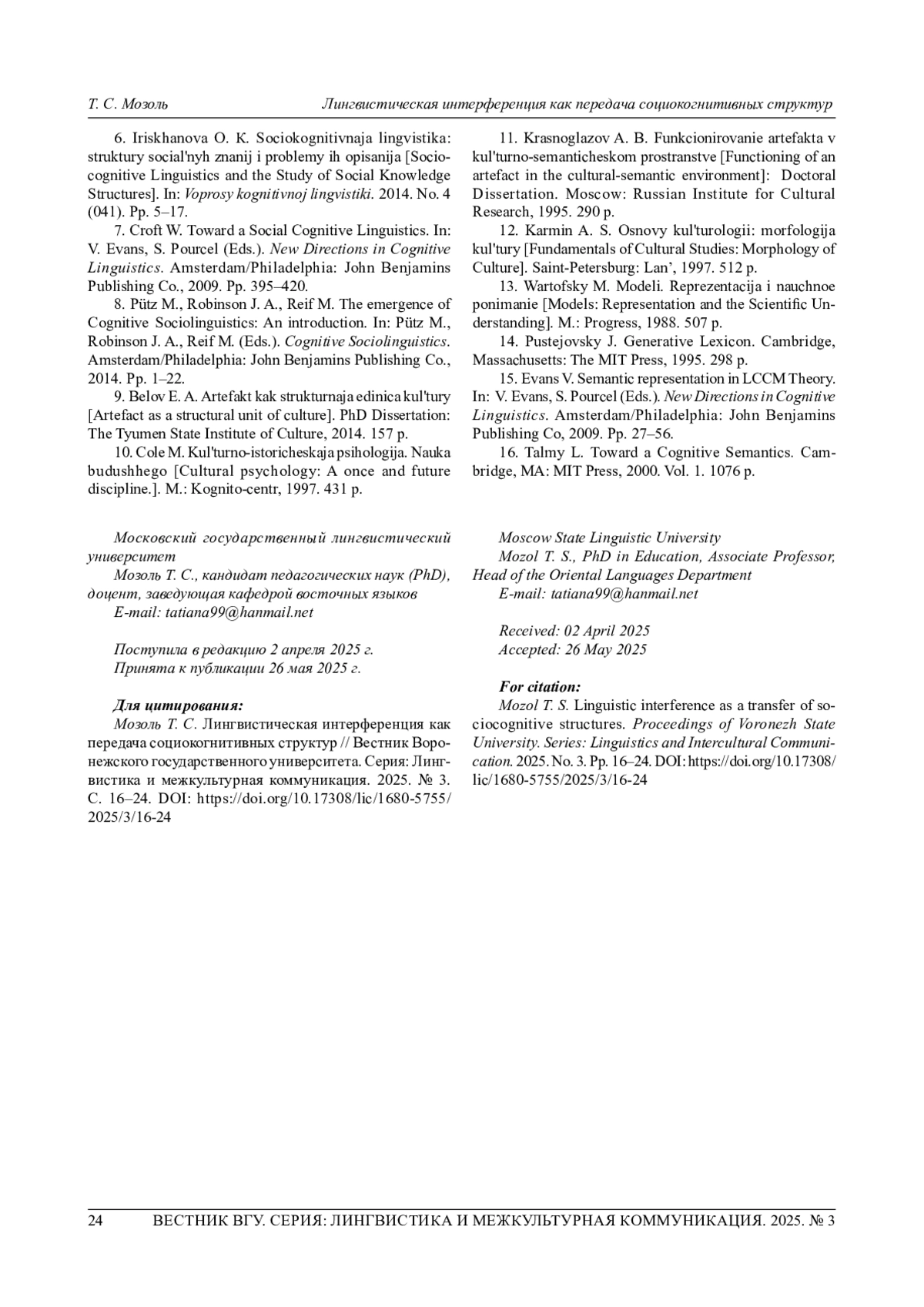 6. 	Ирисханова О. К. Социокогнитивная лингвистика : структуры социальных знаний и проблемы их описания // Вопросы когнитивной лингвистики. 2014. № 4 (041). C. 5-17.