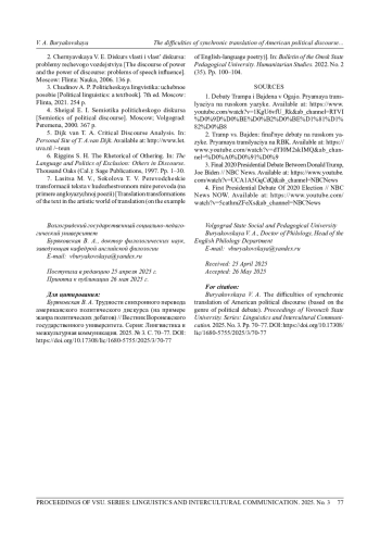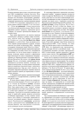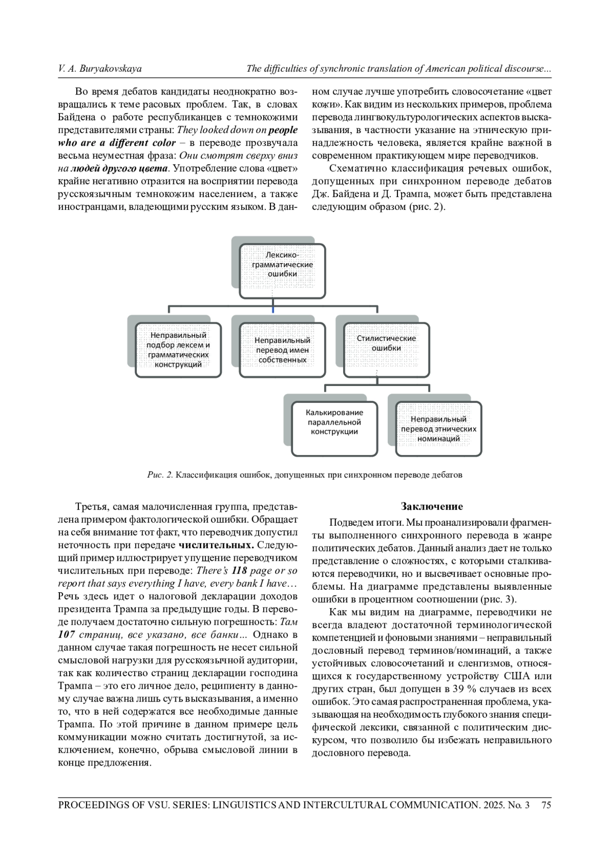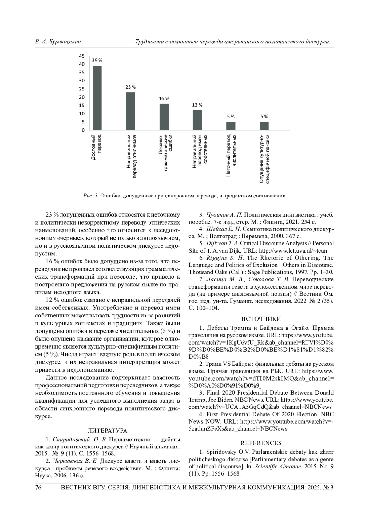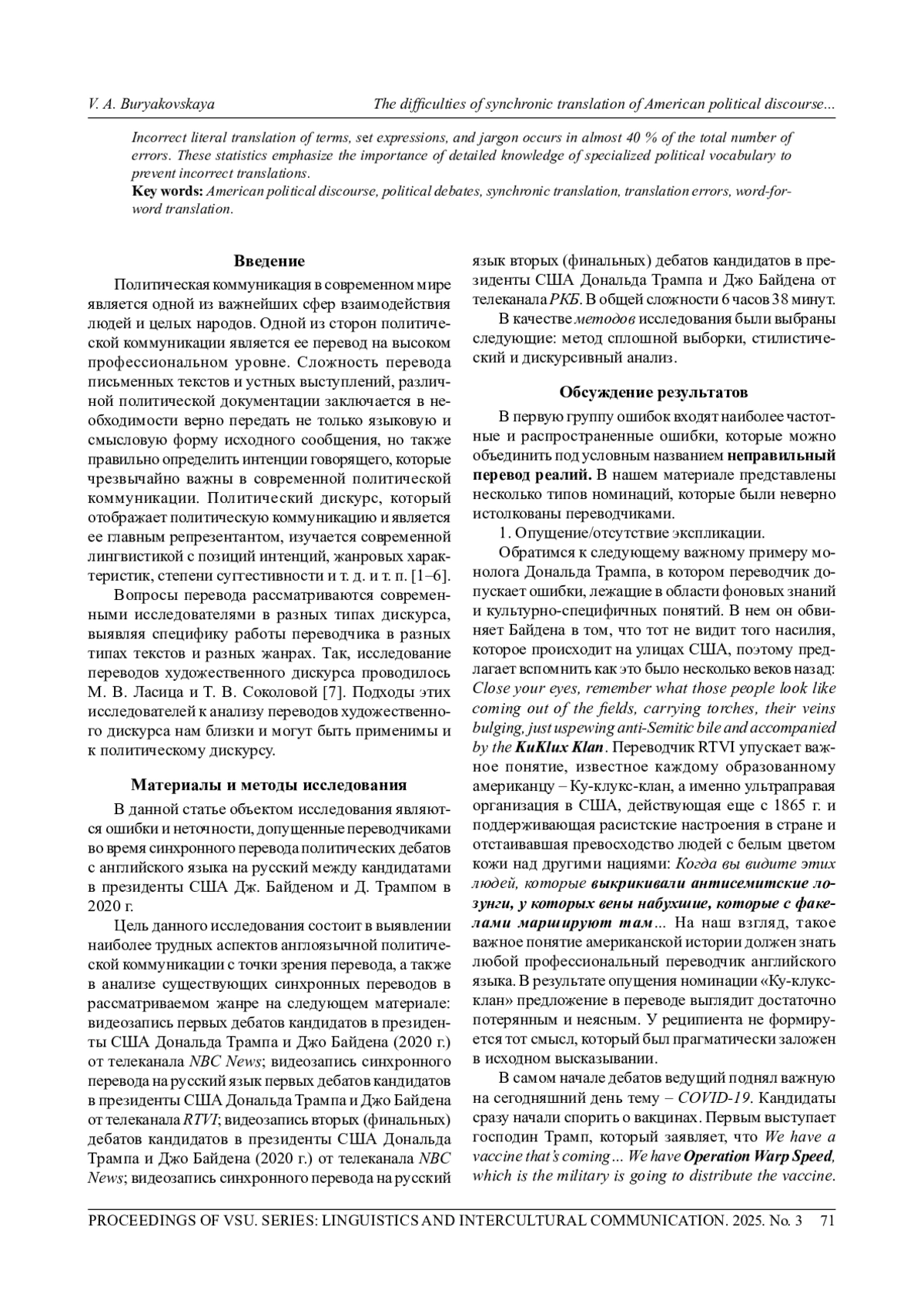 Статья посвящена переводческим ошибкам, допущенным в 2020 г. при синхронном переводе политических дебатов кандидатов в президенты США Дж. Байдена и Д. Трампа. Актуальность исследования определяется общей потребностью выявить наиболее трудные аспекты перевода американского политического дискурса, а также прагматических характеристик переведенных текстов в сфере политической коммуникации. В рамках перевода политических дебатов переводчику необходимо внимательно следить за ходом дискуссии, как между оппонентами, так и между ведущим и участниками. Анализ исследуемого материала показал, что ошибки переводчиков можно разделить на несколько видов: лексико-грамматические ошибки и ошибки, связанные с незнанием культурно-специфичных понятий, некорректным переводом этнических номинаций и имен собственных, устойчивых выражений и сленгизмов. Большинство ошибок и неточностей пришлось на незнание переводчиками различных терминов и понятий, характерных для англоязычного политического дискурса; употребление имен собственных и способы их перевода на переводящий язык; чрезмерное использование переводчиком дословного перевода; неверная передача различных культурно-специфичных понятий; допущение некоторых неточностей в переводе, которые не создают особых помех для осуществления коммуникации, однако все же присутствуют в переводе; чрезмерное использование в переводе устаревших слов и словосочетаний, которые в русском языке утратили свою актуальность. В статье проводится качественный и количественный анализ переводческих ошибок. Переводчики часто испытывают трудности с правильной передачей специальной терминологии и реалий. Неправильный буквальный перевод терминов, устойчивых выражений и жаргонизмов встречается почти в 40 % случаев от общего числа ошибок. Эта статистика подчеркивает важность детального владения специализированной политической лексикой для предотвращения некорректных переводов.
