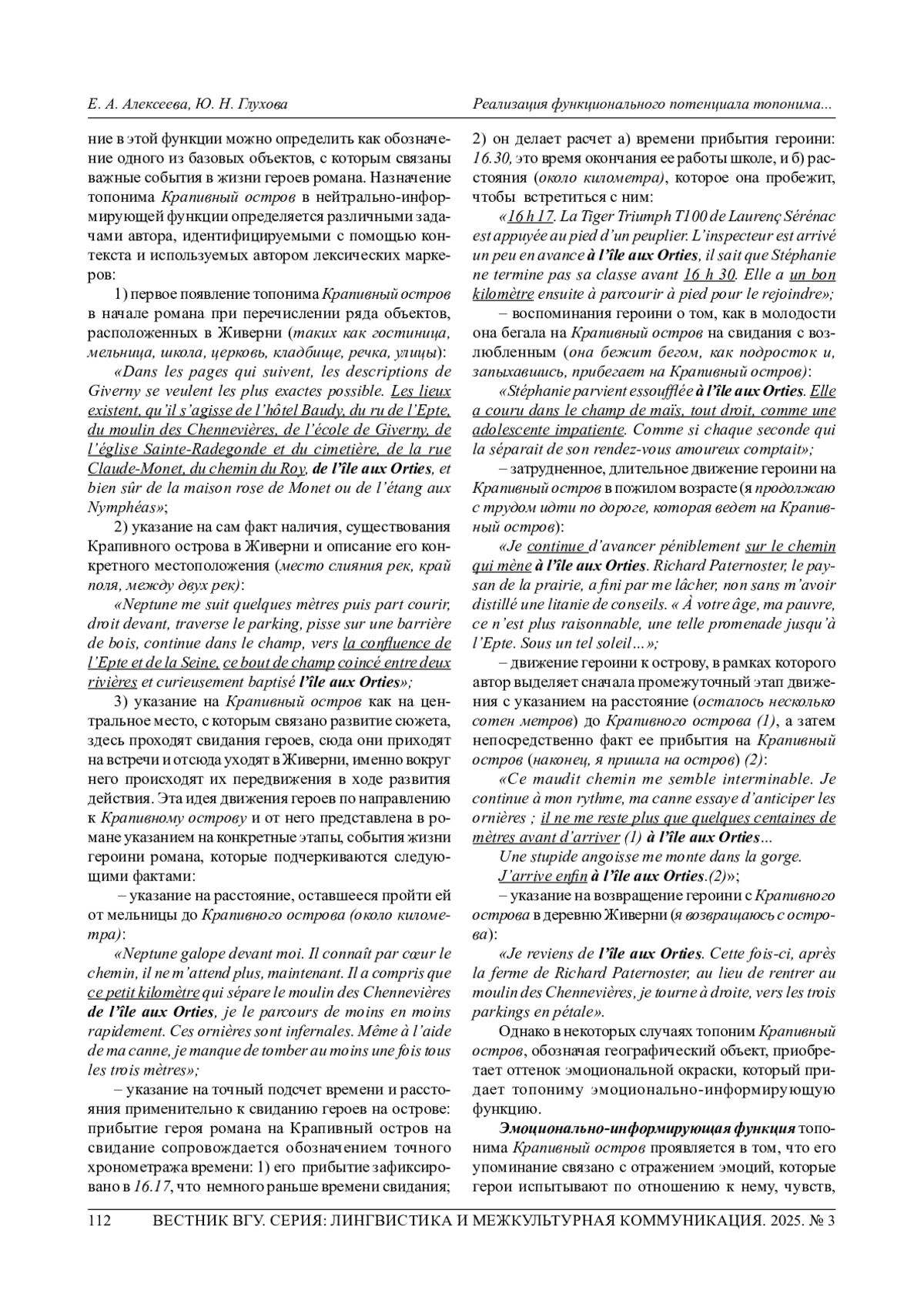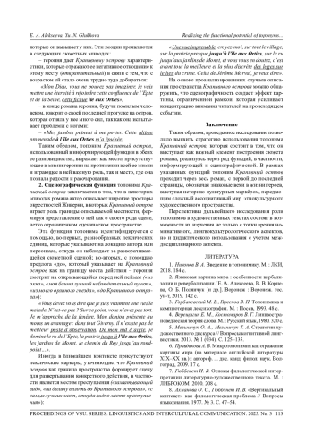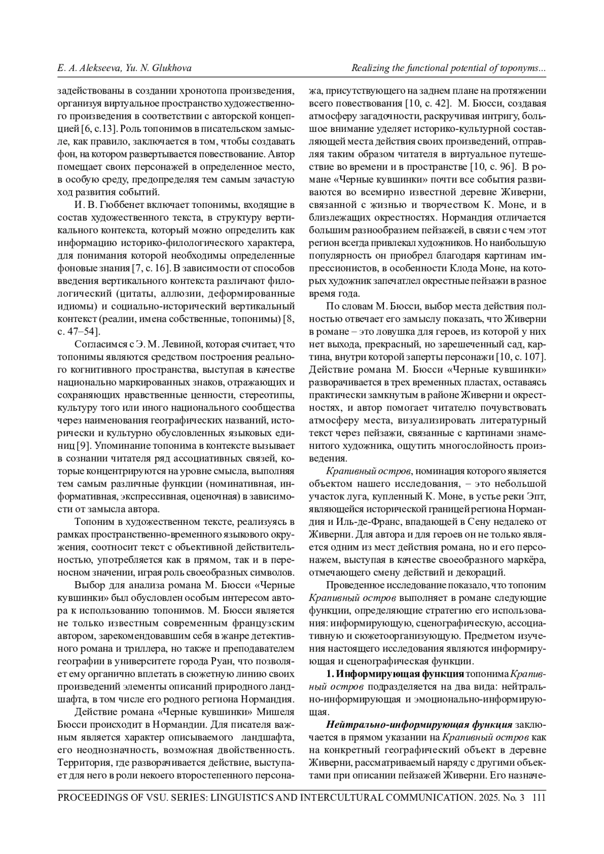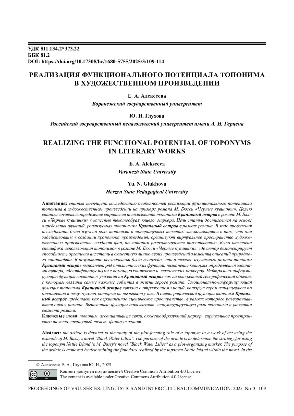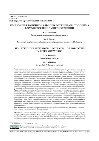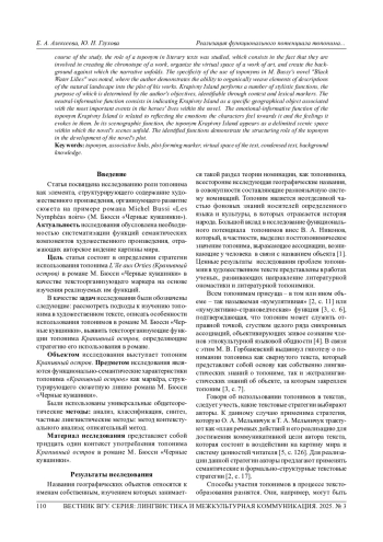 Статья посвящена исследованию особенностей реализации функционального потенциала топонима в художественном произведении на примере романа М. Бюсси «Черные кувшинки». Целью статьи является определение стратегии использования топонима Крапивный остров в романе М. Бюсси «Черные кувшинки» в качестве текстообразующего маркера. Цель статьи достигается на основе определения функций, реализуемых топонимом Крапивный остров в рамках романа. В ходе проведения исследования была изучена роль топонима в литературных текстах, заключающаяся в том, что они задействованы в создании хронотопа произведения, организуют виртуальное пространство художественного произведения, создают фон, на котором развертывается повествование. Была отмечена специфика использования топонимов в романе М. Бюсси «Черные кувшинки», где автор демонстрирует способность органично вплетать в сюжетную линию своих произведений элементы описаний природного ландшафта. В результате исследования было выявлено, что в тексте изучаемого романа топоним Крапивный остров выполняет ряд стилистических функций, назначение которых определяется задачами автора, идентифицируемыми с помощью контекста и лексических маркеров. Нейтрально-информи-рующая функция состоит в указании на Крапивный остров как на конкретный географический объект, с которым связаны самые важные события в жизни героев романа. Эмоционально-информирующая функция топонима Крапивный остров связана с отражением эмоций, которые герои испытывают по отношению к нему, чувств, которые он вызывает у них. В сценографической функции топоним Крапивный остров предстает как ограниченное сценическое пространство, в рамках которого разворачиваются сцены романа. Выявленные функции доказывают структурирующую роль топонима в развитии сюжета романа.