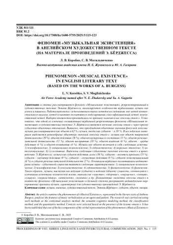 В статье рассматривается феномен «Музыкальная экзистенция», репрезентированный в художественных текстах Энтони Бёрджесса, анализируются особенности вербализации музыки как агенса и пациенса. Работа выполнена с использованием таких методов исследования, как метод контекстуального анализа, метод семантико-когнитивного моделирования, классификационный метод, количественный метод. Выборка контекстов производилась по признаку наличия в них лексемы «music». Установлено, что одной из ключевых составляющих вербальной репрезентации феномена «Музыкальная экзистенция» в художественных текстах Э. Бёрджесса является изучение лексемы «music» через призму субъектно-объектных отношений. Выявлено, что преобладают объектные значения фокусной лексемы: музыка рассматривается как объект в 62 % случаев, тогда как субъект - в 38 %. В исследуемом материале выделяется разнообразие объектных значений лексемы «music»: музыка как объект творческой деятельности (29 %), объект действия (20 %), объект каузирующего состояния (15 %), объект речемыслительной деятельности (12 %), объект восприятия (10 %), объект владения (6 %), объект - орудие действия (4 %) и объект-комитатив (4 %). Музыка как объект включает в себя следующие аспекты: 1) психофизические; 2) эмоционально-психологические; 3) гедонистические; 4) морально-этические; 5) интеллектуальные; 6) суггестивные. Выделены следующие субъектные значения лексемы «music» в произведениях Э. Бёрджесса: музыка как субъект действия, агенс (50 %), субъект - носитель признака (25 %), субъект - каузатор действия (9 %), субъект - соучастник действия (8 %), субъект экзистенциальный (6 %) и субъект речемыслительной деятельности (2 %). Основными вербально-когнитивными индикаторами музыки - субъектной сущности являются следующие характеристики: 1) эмоционально-психологические; 2) психофизические; 3) сенсуалистические; 4) гедонистические; 5) физиологические; 6) физические. Таким образом, музыка, выступая как ведущая (субъект) и ведомая (объект) сущность, соотносится с ключевыми аспектами человеческой жизни, такими как «чувство», «здоровье», «ощущение», «эмоция», «социум», «мораль/этика», «интеллект», «психика» и др. Доминантные элементы лексемы «music» в контексте феномена «Музыкальная экзистенция» в большей степени раскрывают индивидуально-маркированные признаки музыки, характерные для художественных произведений Э. Бёрджесса.