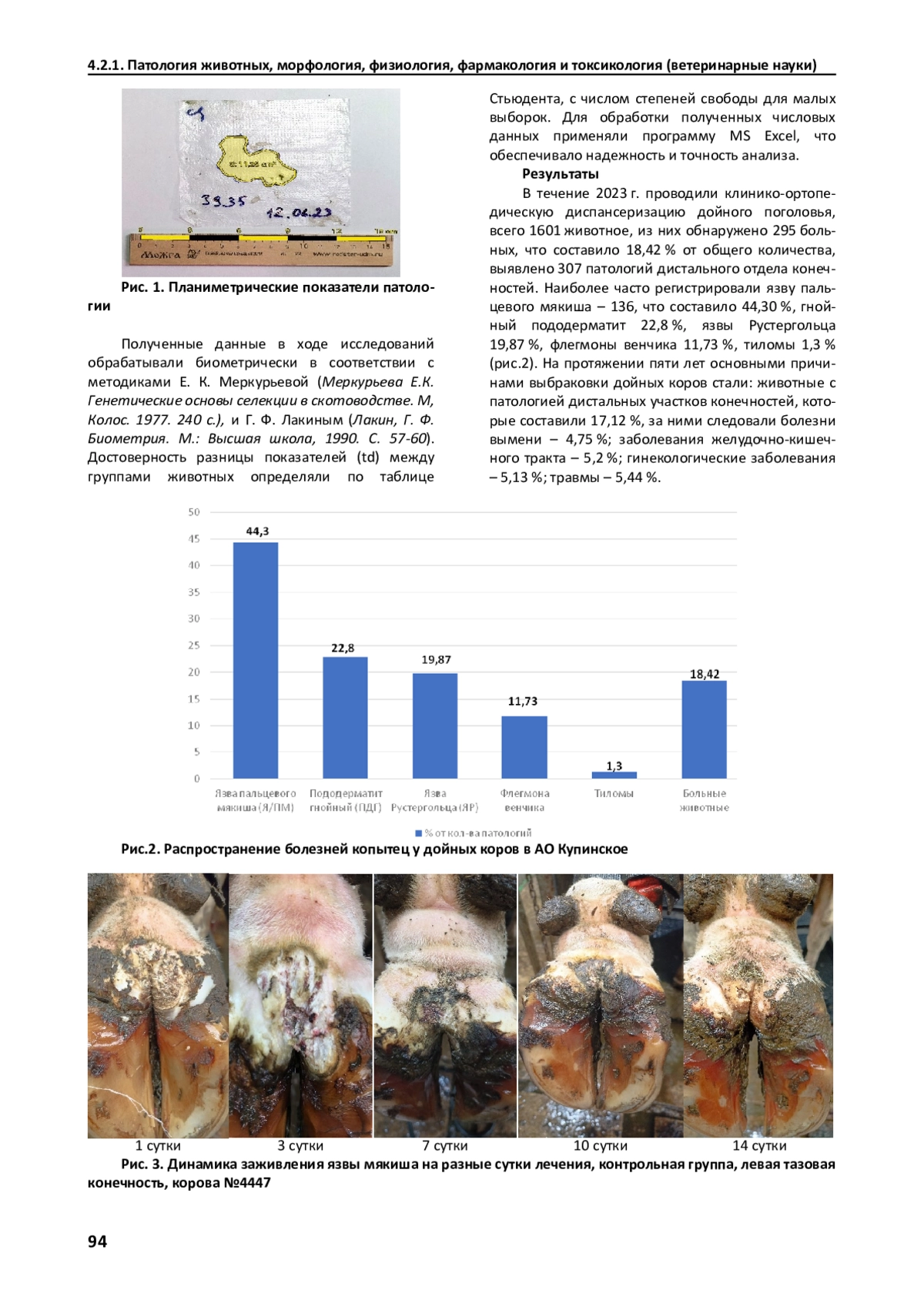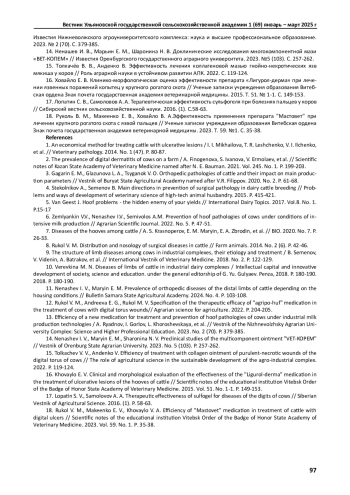 11. Ненашев И. В., Марьин Е. М. Распространенность ортопедических болезней дистального отдела конечностей у крупно-рогатого скота в зависимости от условий содержания // Известия Самарской государственной сельскохозяйственной академии. 2024. № 4. С. 103-108. EDN: SBLCIU