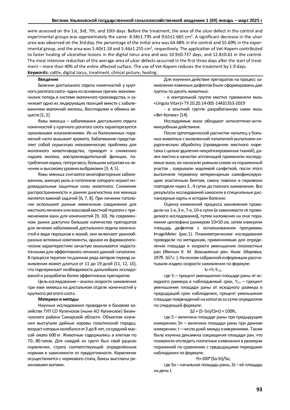 В статье рассматривается терапевтическая эффективность препаратов, применяемых для лечения язв пяточного мякиша у дойных коров. Научные исследования проводили в хозяйстве Самарской области. Объектом изучения выступали дойные коровы голштинской породы в возрасте от 3 до 8 лет со средней массой около 600 кг. Для изучения действия препаратов на процесс заживления язвенных дефектов были сформированы две группы по десять животных, в контрольной группе местно применяли мазь «Ungula Vita+)», в опытной группе -«Вет-Копем». Обе мази обладают антисептико-антимикробным действием. После ортопедической расчистки копытец у больных животных с выявленной патологией выполняли хирургическую обработку, далее местно в качестве аппликаций применяли исследуемые мази, их наносили ровным слоем на пораженный участок закрывали марлевой салфеткой, после этого выполняли перевязку ветеринарным самофиксирующим эластичным бинтом, смену повязки и перевязки повторяли через 3…4 суток до полного заживления. Оценку изменений в течение заживления патологического процесса проводили на 1-е, 3-е, 7-е, 10-е сутки. Перед началом лечения площадь язвенного дефекта в контрольной и опытной группах была примерно одинаковой, составляла 8,38±1,795 и 9,61±1,665 см2. Существенное уменьшение площади язв наблюдали на 3-е сутки, процент к исходной площади составлял в контрольной группе 64,48 % и опытной - 55,69 %, а площадь 5,40±1,18 и 5,46±1,255 см2 соответственно. Применение препарата «Вет-Копем» способствовало более быстрому лечению язвенных поражений в области мякиша и составила 10,9±0,737 сутки, а в контрольной - 12,8±0,61. Наиболее интенсивное сокращение средней площади язвенных дефектов происходило в первые три дня после начала лечения - более 40 % от всей пораженной поверхности. Применение препарата «Вет-Копем» позволит сократить лечение на 1,9 суток.