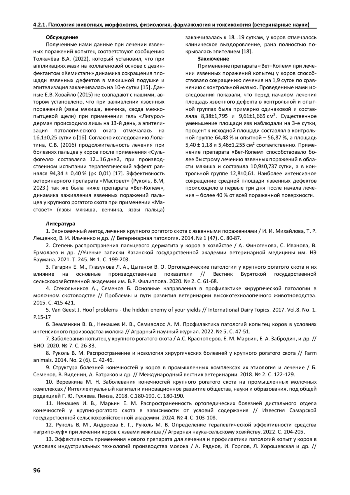 15. Толкачёв В. В., Анденко В. Эффективность лечения коллагеновой мазью гнойно-некротических язв мякиша у коров // Роль аграрной науки в устойчивом развитии АПК. 2022. C. 119-124.